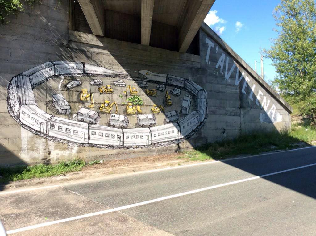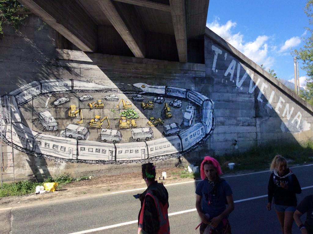 Using Street Art as an act of resistance, Blu came to Chiomonte to support four activists who were recently charged for “Corruption”. As Blu arrived, the Police was already on location close to the Chiomonte’s city center where the wall was located. Forced to move to a new location under a bridge, the Italian artist was inspired to create this powerful piece that could be dubbed “The Train, The Serpent and The Capital”. Money is encircled by bulldozers which are encircled by police vehicles which are encircled by a snake train which is bitting its own tail.. Simple and genial as usual with Blu.