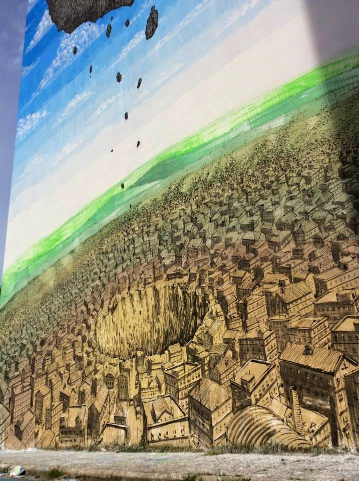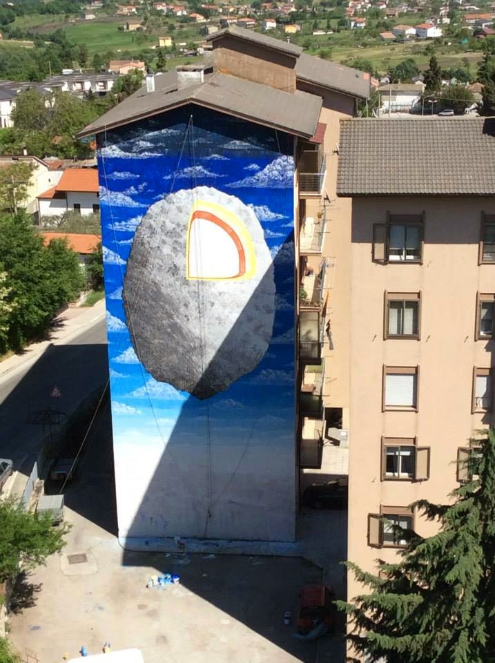 Painting on the streets of Campobasso, it took six days for the legendary painter to complete this impressive piece. Located in a degraded neighborhood with several social issues, the piece shows a huge floating rock suspended in the sky, it left a huge crater in the city but the vibrant colors tells the habitants that there is hope and that they can continue to dream.