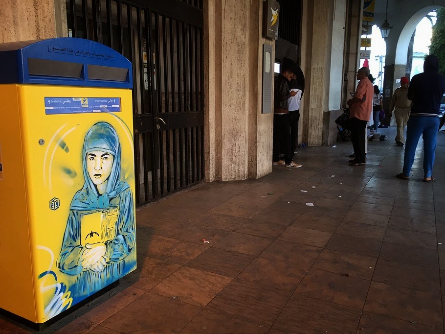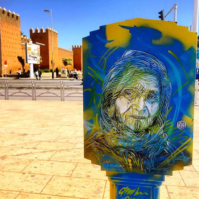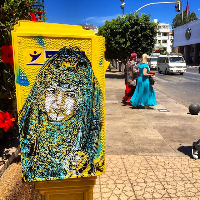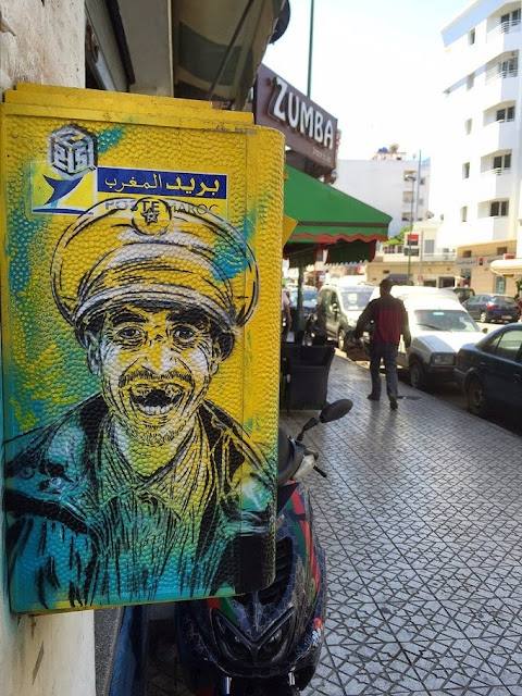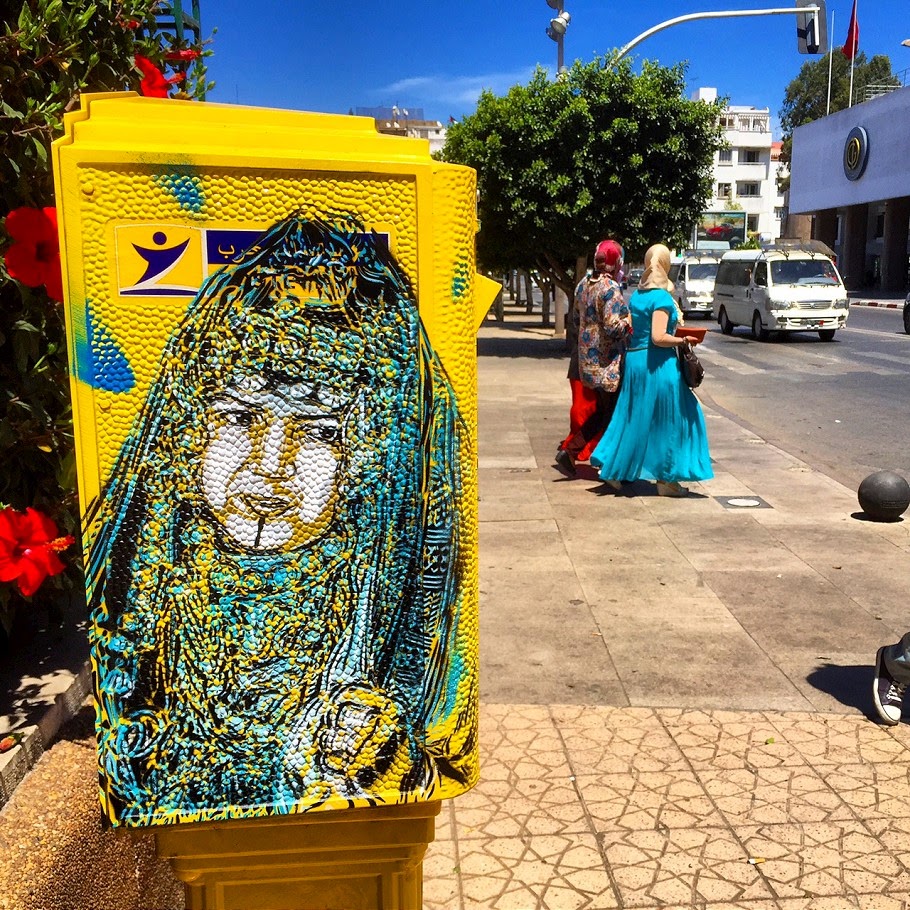 Painting a series of smaller stencil pieces all on created on post boxes around the city, C215 introduced some new, locally themed images as well as some of his classics. Depicting local people that can be seen on the streets of Rabat, Paris-based artists created sort of monument to these regular people. Using bright yellow color as a background, black and white for stencils, and couple of shades of blue for accents, the works are blending perfectly with the surface they are painted on, as if they were essential part of it.