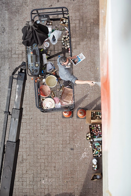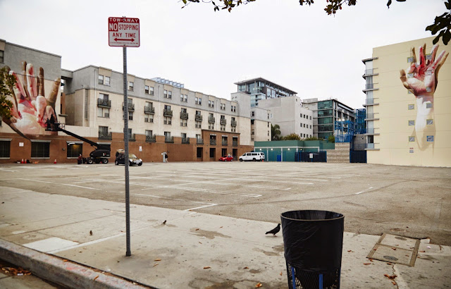 The German artist spent a few days working up high on his cherry picker to create these large-scale murals showing some of his signature hyper-realistic hand-based imagery.