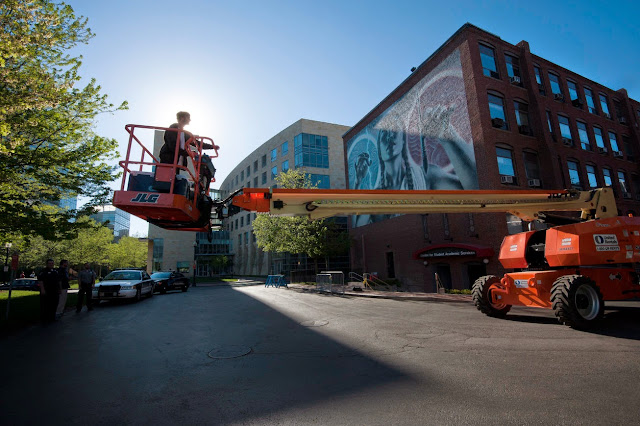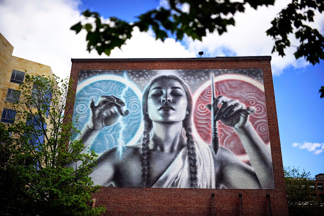 Using his signature striated shading technique combined with red and blue hues, El Mac installed a beautiful and impressive mural on Meserve Hall overlooking Centennial Common. The mural showing a young girl holding a brush and a lightning bolt is the latest installation in Northeastern’s Public Art Initiative.