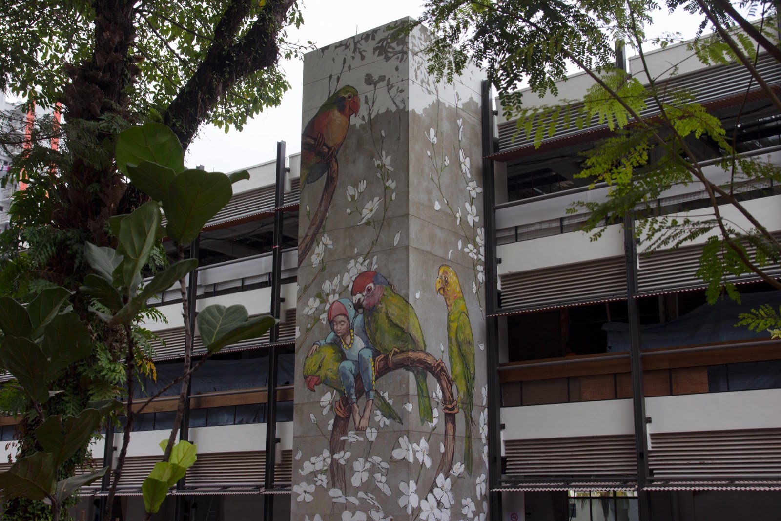 This project was to create a series of murals, inspired by the artwork of Pathlight students. The two students selected were Selena, whose whimsical like birds and botanicals inspired the composition with parrots and Jun-Yi whose simple line drawing of animals inspired Ernest’s contrasting naturalistic paintings of wild animals.