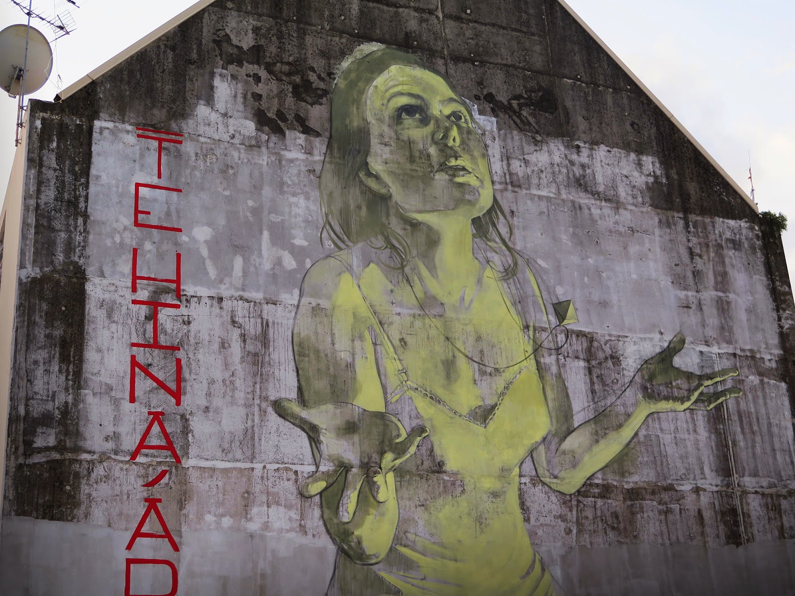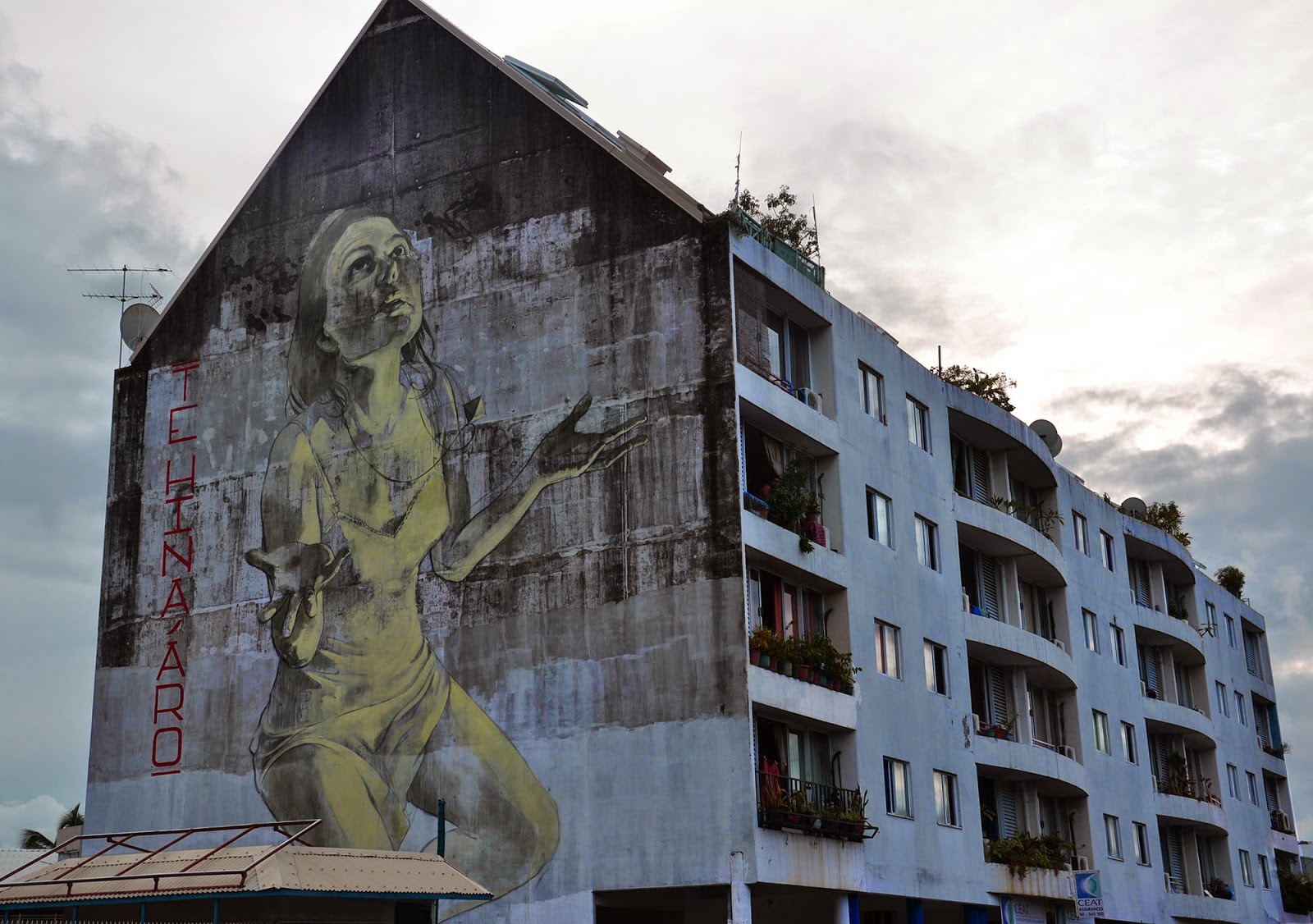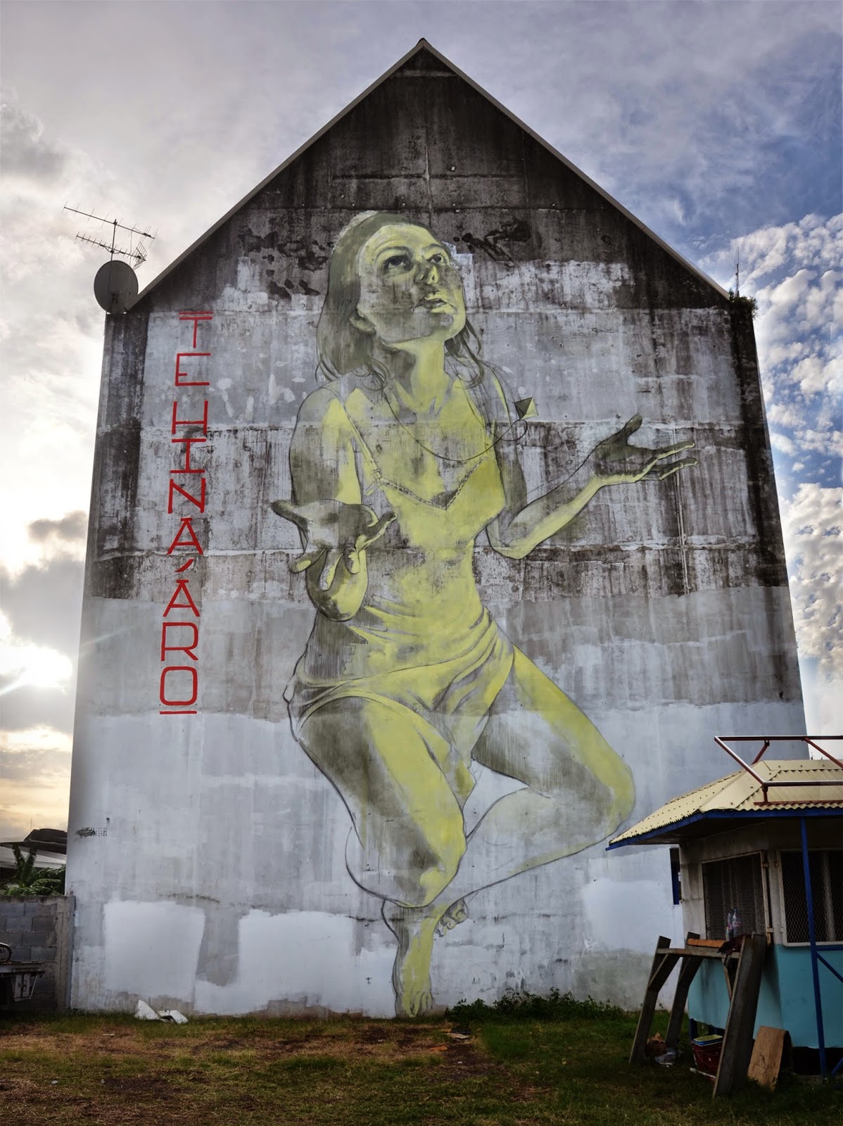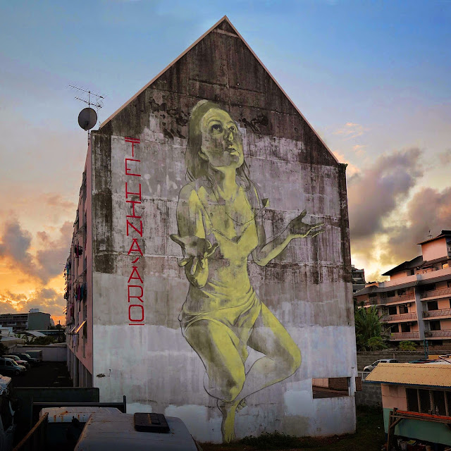 Our friend Faith47 was also on the island where she was given a massive building to work with. The Cape Town-based muralist brought to life some of her signature imagery with this delicate and sensual mural entitled “te hina ‘aro”.