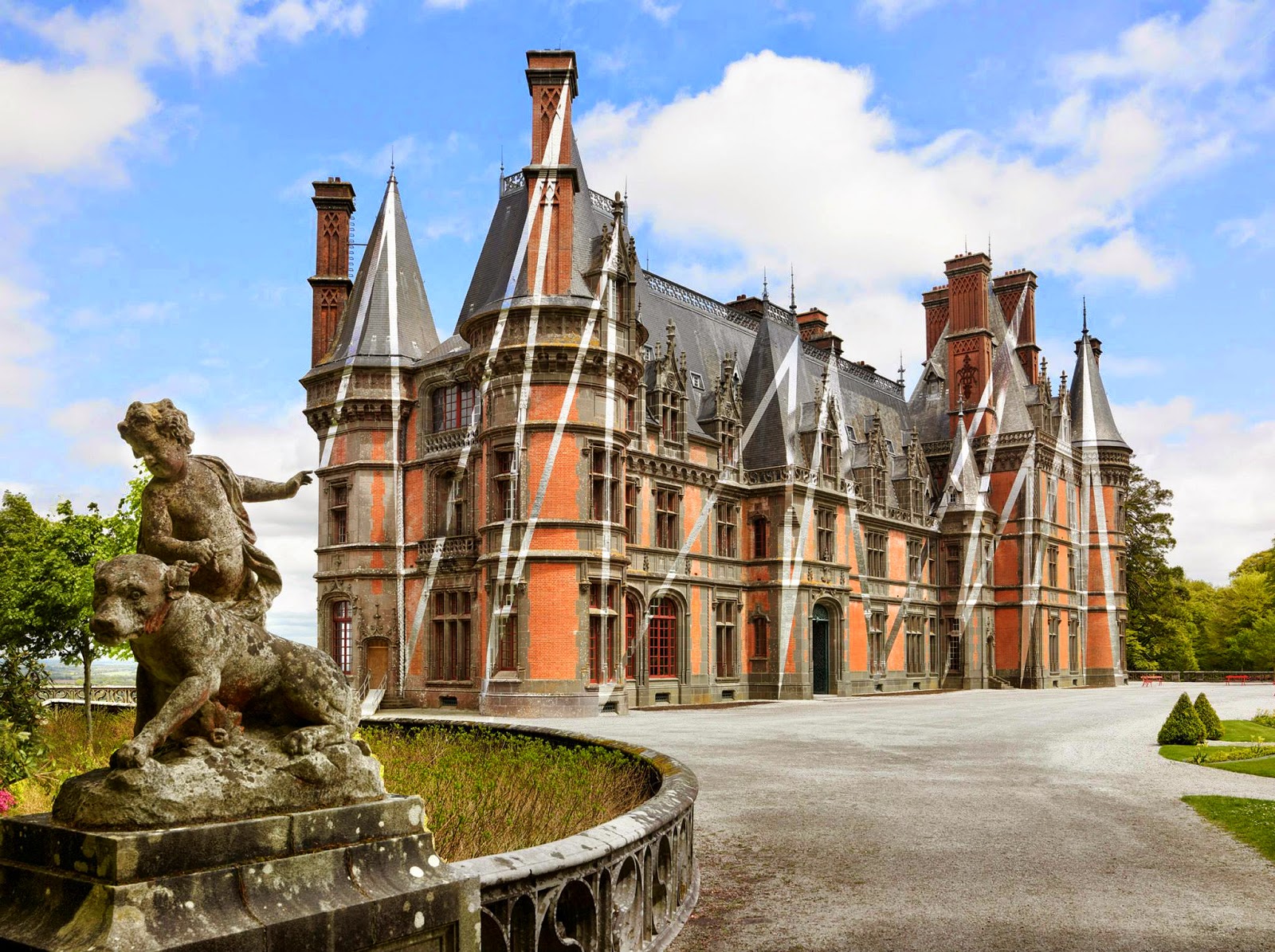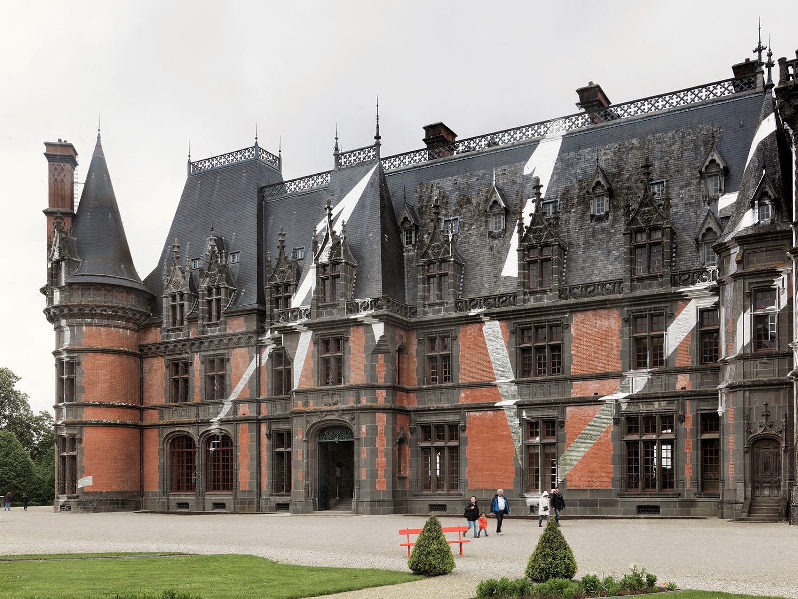 After a stunning series of installations a few weeks ago in Paris, Felice Varini has now landed in Saint-Goazec where he just finished working on this massive new piece entitled “Castle’s ZigZag”. This impressive anamorphic illusion has been painted on the Château de Trévarez which is a stately home in the commune of Saint-Goazec in Finistère, in Brittany, France. It was commissioned by James Kerjégu, Chairman of the General Council of Finistère, and built at the end of the 19th century by the French architect Walter-André Destailleur. Quite rare to see such old buildings and structures being painted. The Swiss artist also created “Red Bench Ellipse” which is located within the castle’s garden.