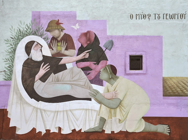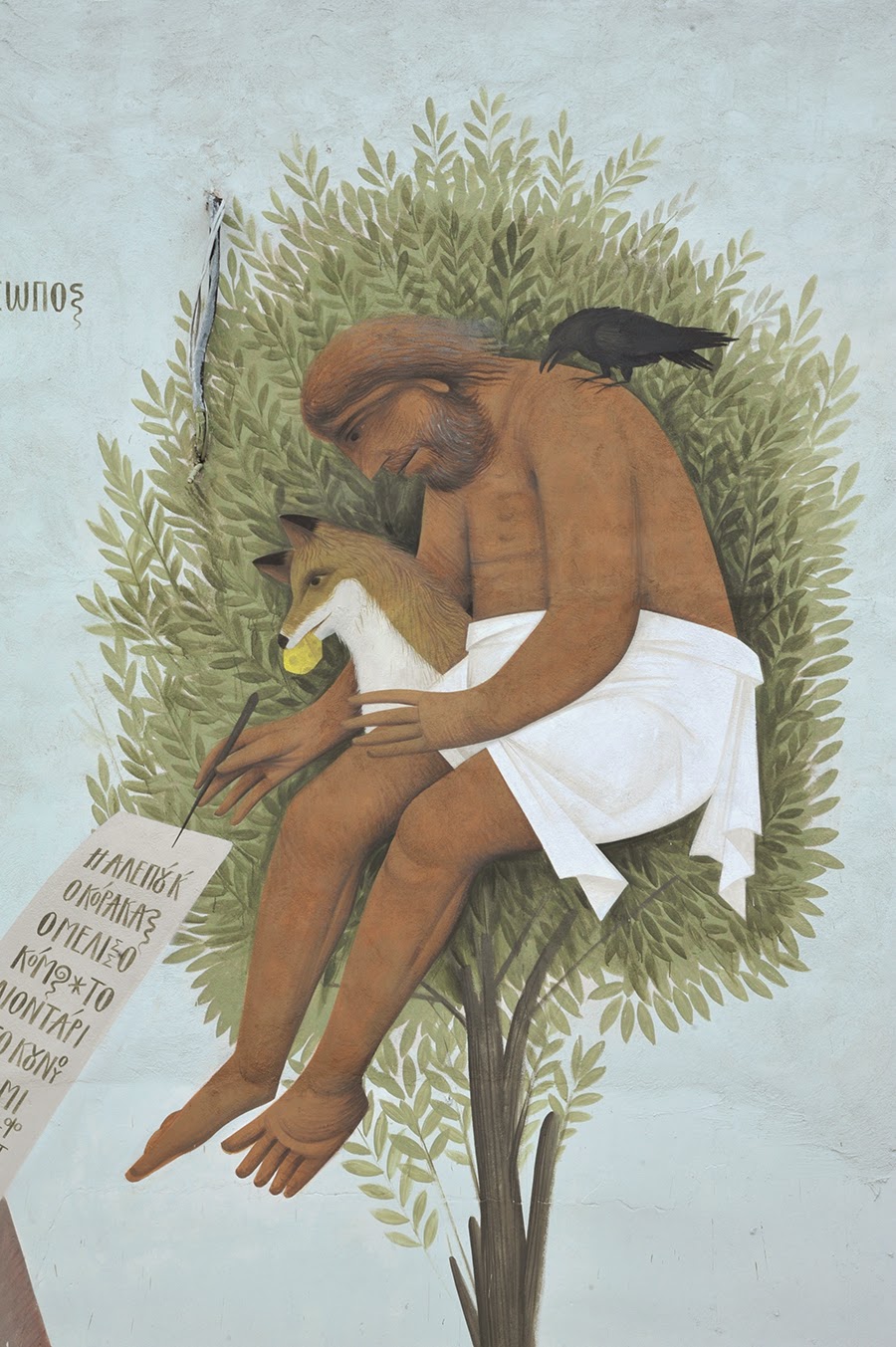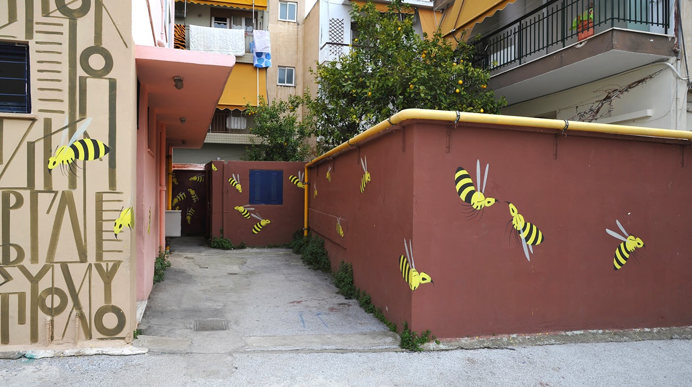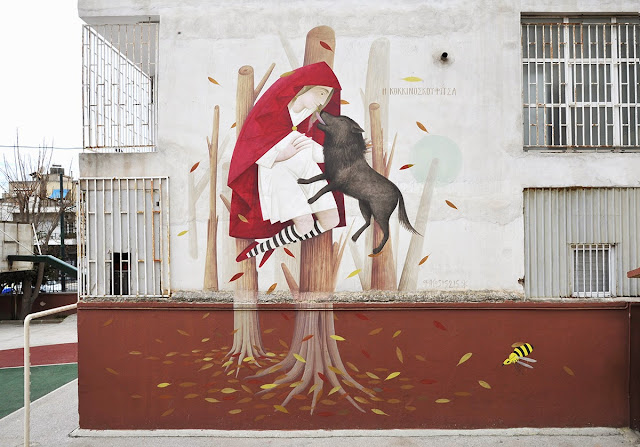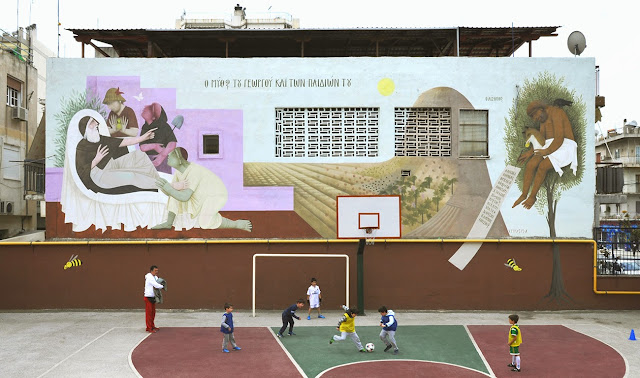 The Greek artist spent over two weeks inside the complex to create the first ever illustrated school in the country. The result is featuring his classical Greek Byzantine inspired imagery which redevelops artistically the entirety of the courtyard area. He decided to use themes that have their roots in ancient Greek myths, and teach values such as honesty, solidarity, curiosity and willingness to learn.