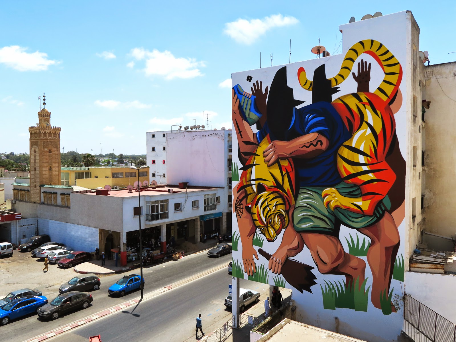 In town for the Rabat Jidar Festival, the Barcelona-based muralist brought to life this beautiful and super vibrant piece showing a fight scene between a group of surreal characters mixing animals, humans and shadows.