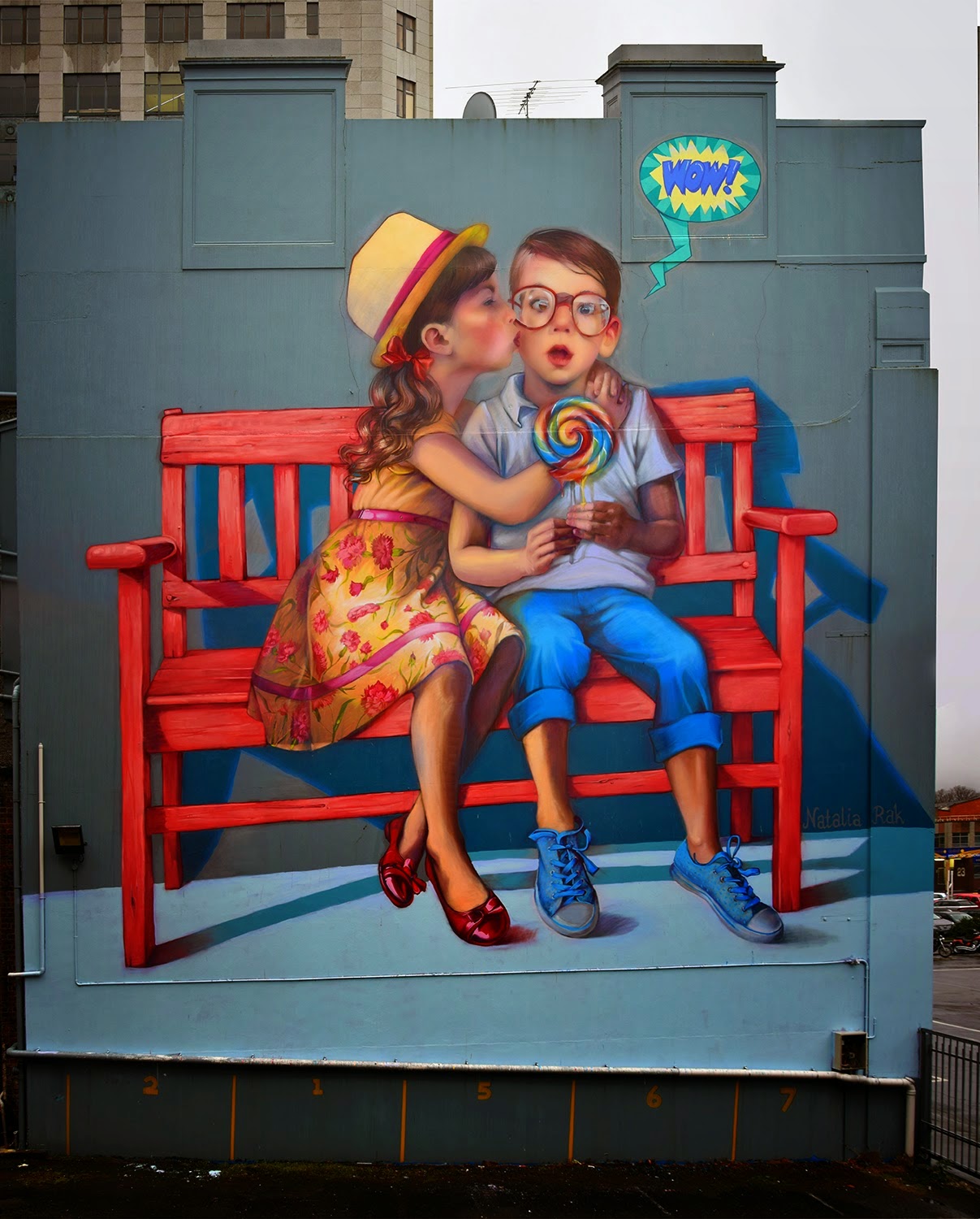 Natalia spent about a week working on this beautiful and cute artwork which is entitled “Love Is In The Air”. The piece shows two young child sat on a red bench, the boy is eating a lollipop while the girl gives him a sweet kiss.