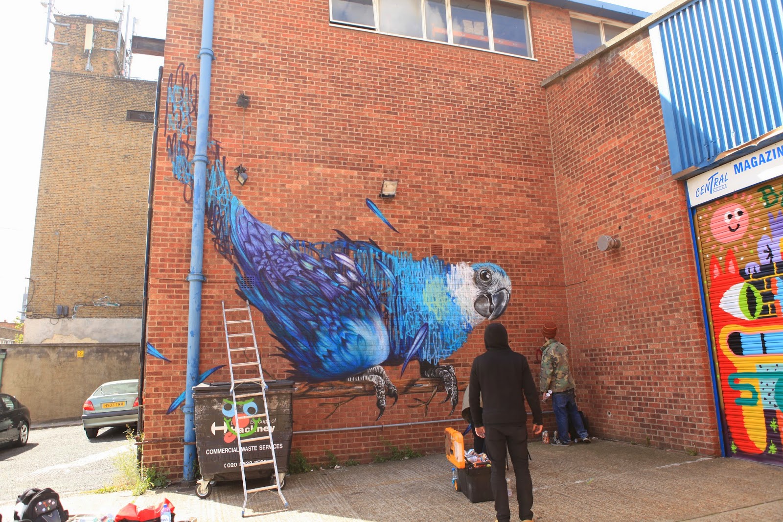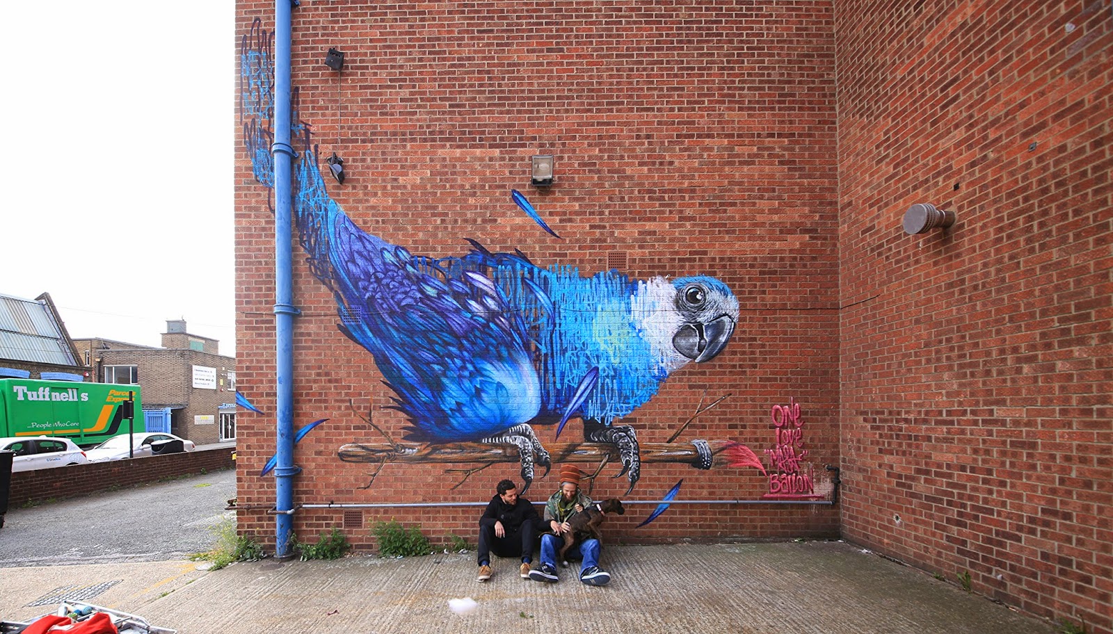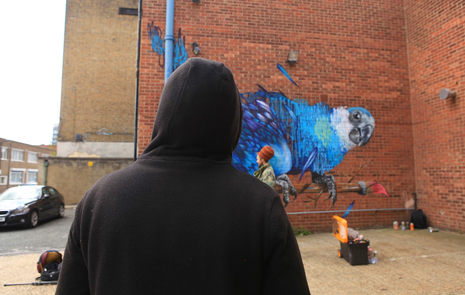 Most collaborations take a few days to plan out and then to materialise on a wall. All it takes is a rough sketch and for the artists to agree on a time they are both free to work together. This collaboration between London based artist Louis Masai and Sao Paolo based Mateus Bailon took two years until it happened. The two artist’s ever conflicting busy schedules and their different geographical locations was holding the project back until this week; they managed to work on a piece together painting a Spix’s macaw. The little blue bird is a native to Brazil where Mateus hails from and is critically endangered. This ties in perfectly with the artists’ individual styles. Masai is known for painting endangered species while Bailon’s work is often centred around animals; mostly birds.