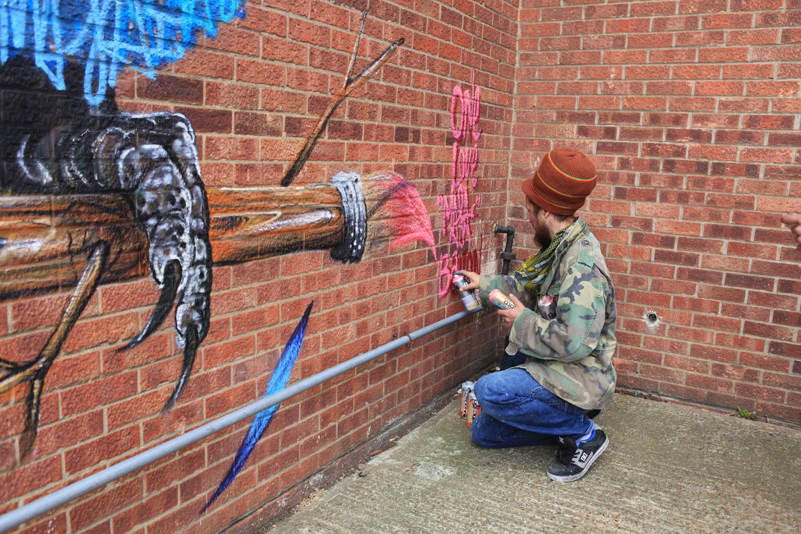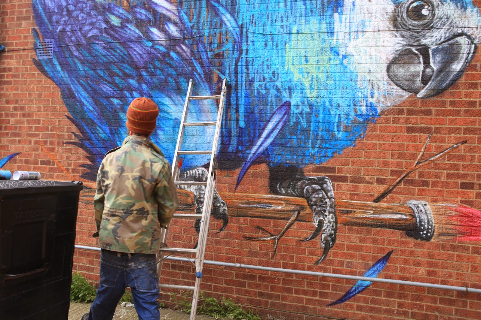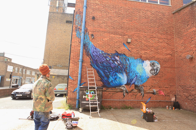 Most collaborations take a few days to plan out and then to materialise on a wall. All it takes is a rough sketch and for the artists to agree on a time they are both free to work together. This collaboration between London based artist Louis Masai and Sao Paolo based Mateus Bailon took two years until it happened. The two artist’s ever conflicting busy schedules and their different geographical locations was holding the project back until this week; they managed to work on a piece together painting a Spix’s macaw. The little blue bird is a native to Brazil where Mateus hails from and is critically endangered. This ties in perfectly with the artists’ individual styles. Masai is known for painting endangered species while Bailon’s work is often centred around animals; mostly birds.