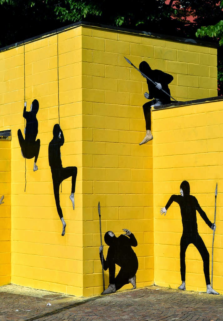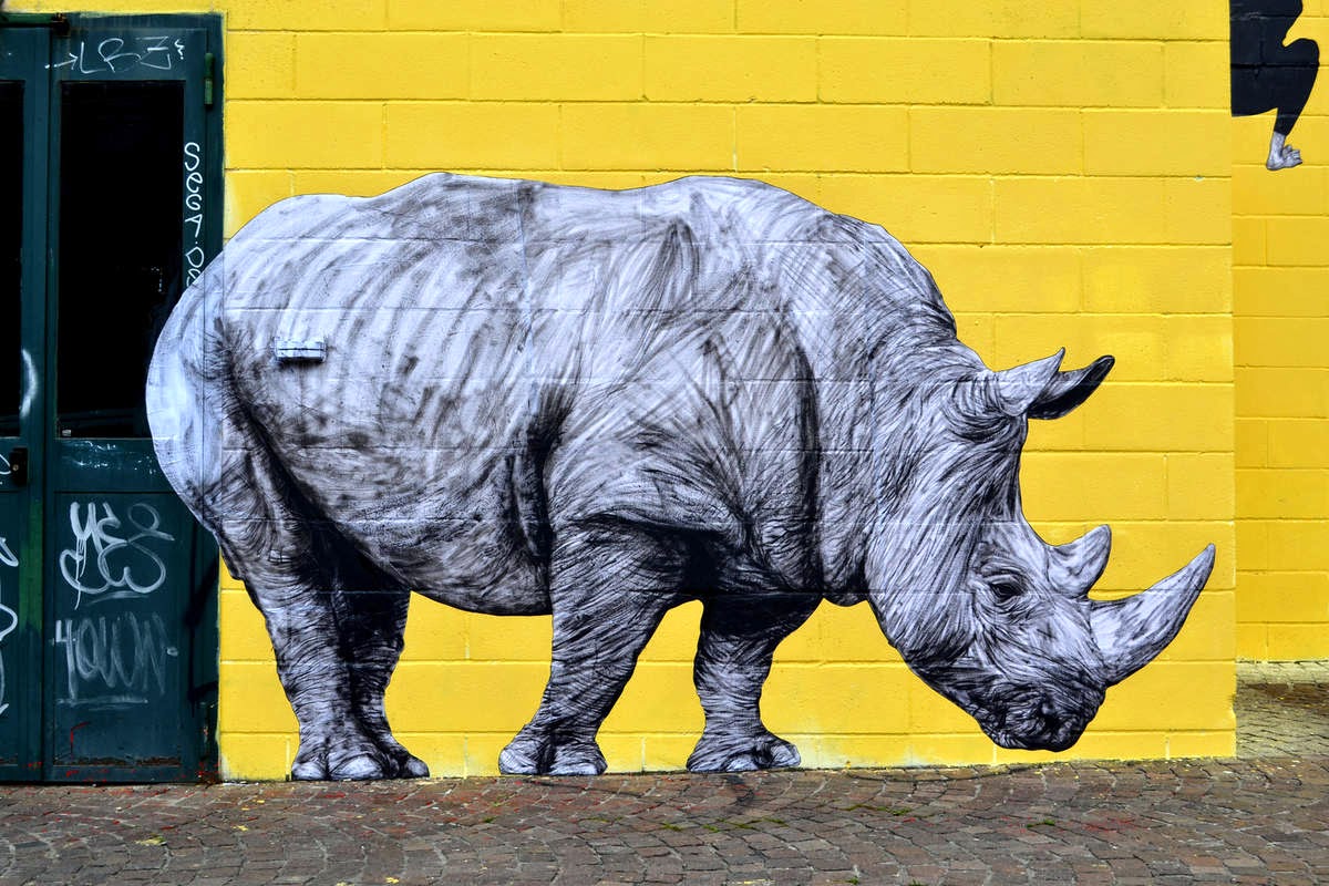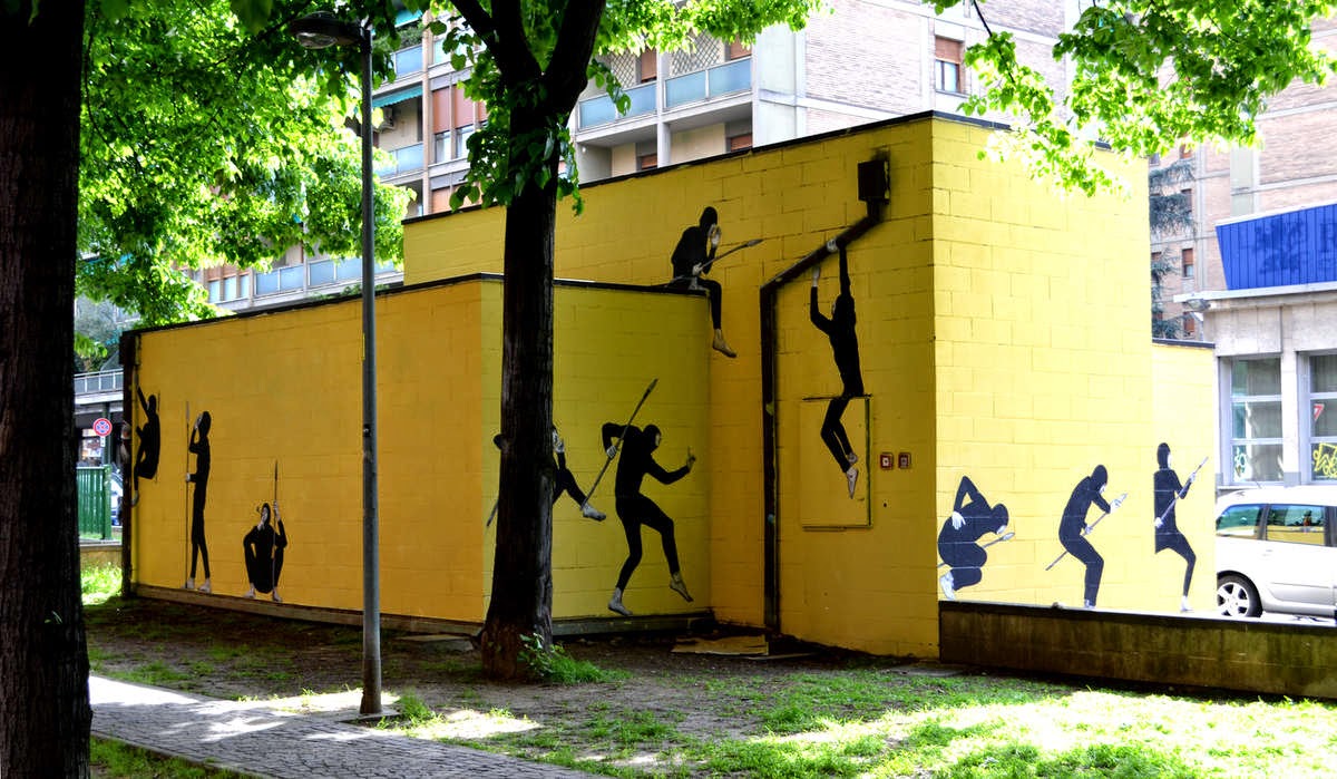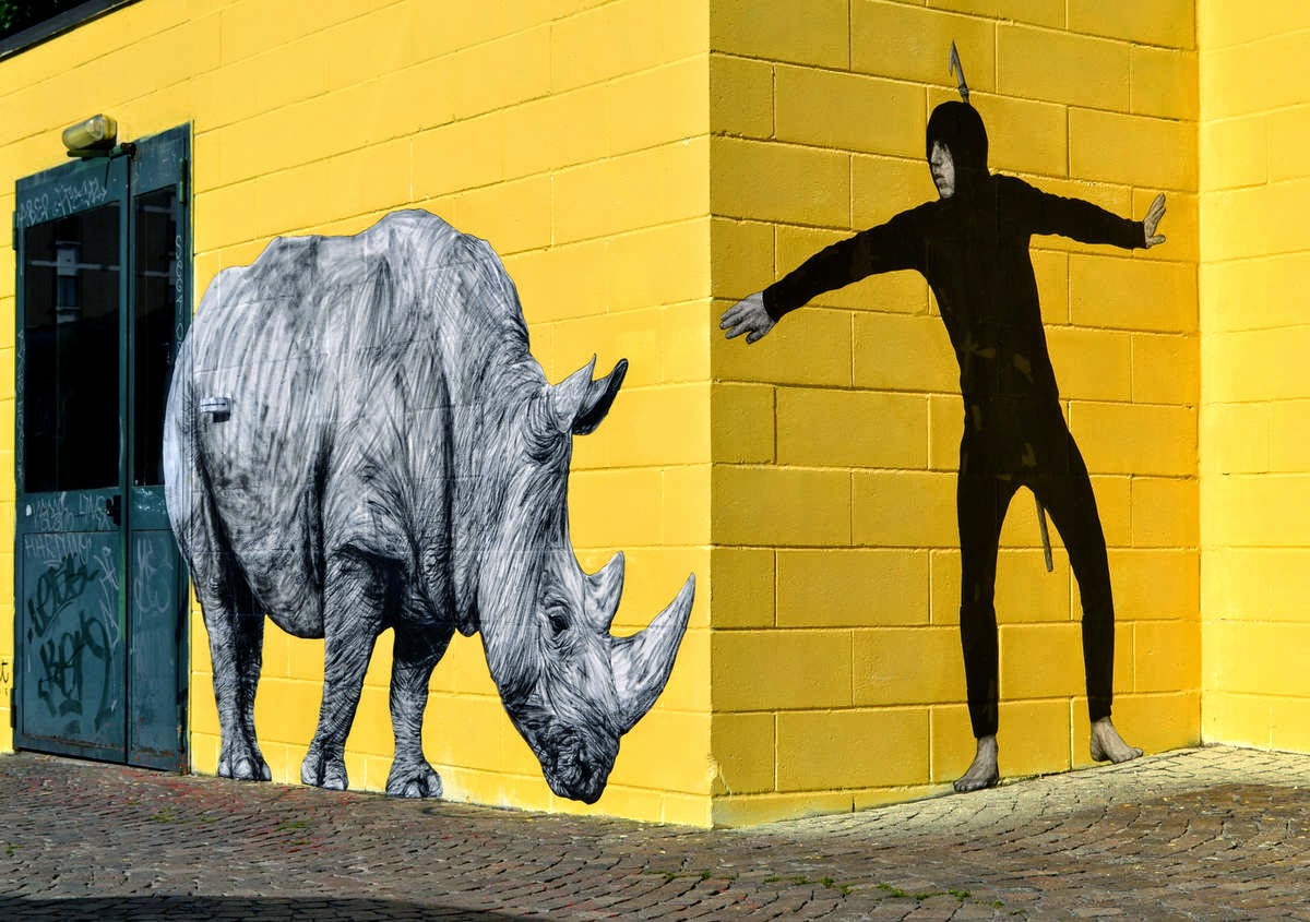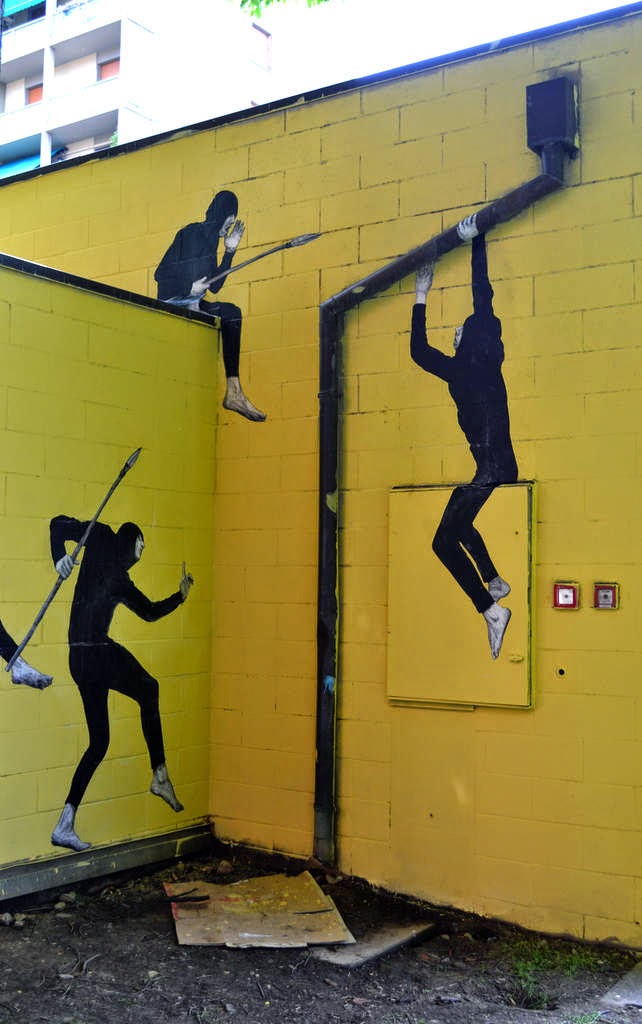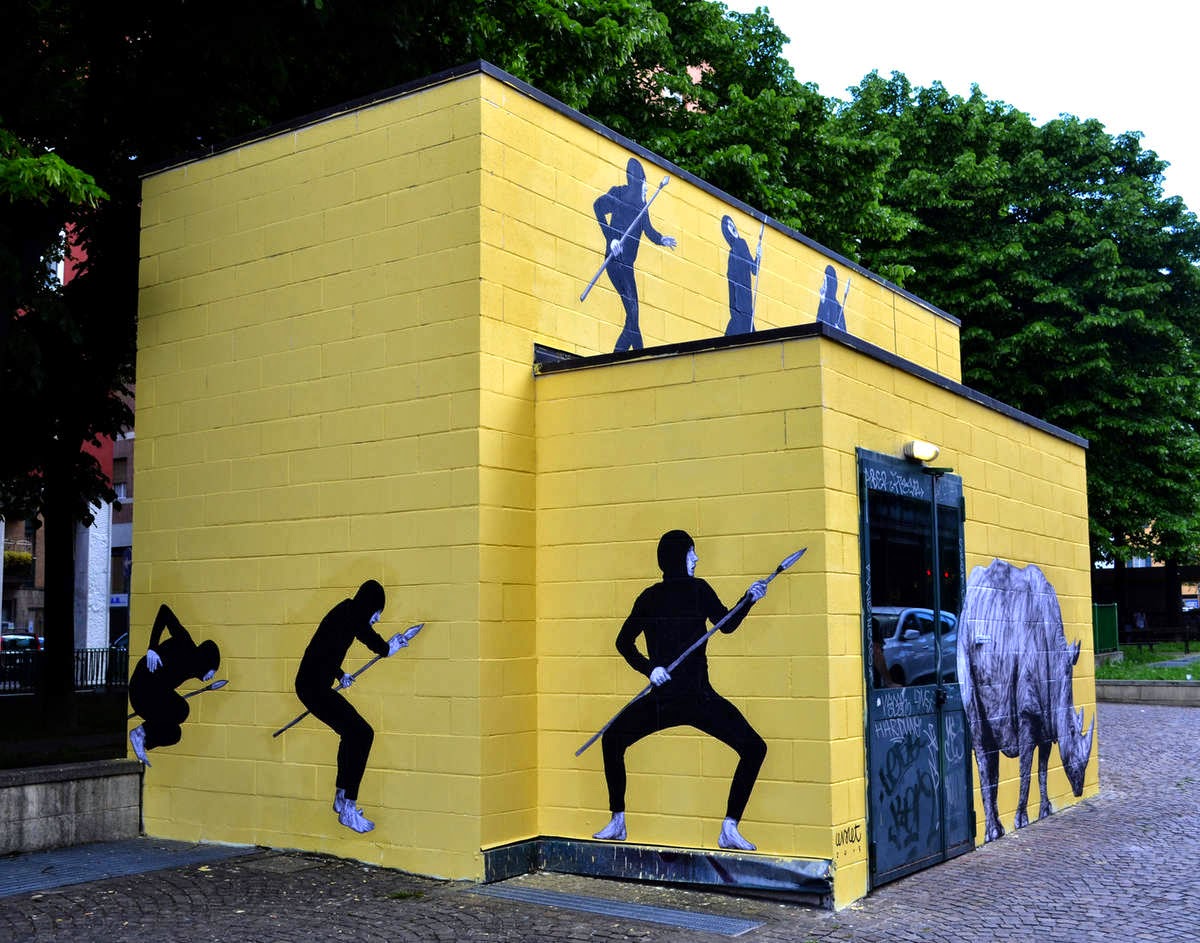Working on the streets of Bologna, the French artist was given an entire building to transform with his imagery. The end-result is pretty cool and is entitled “The Hunt”. It shows some kind of European Ninja in various positions trying to catch a Rhino which doesn’t seems to be very bothered about it.