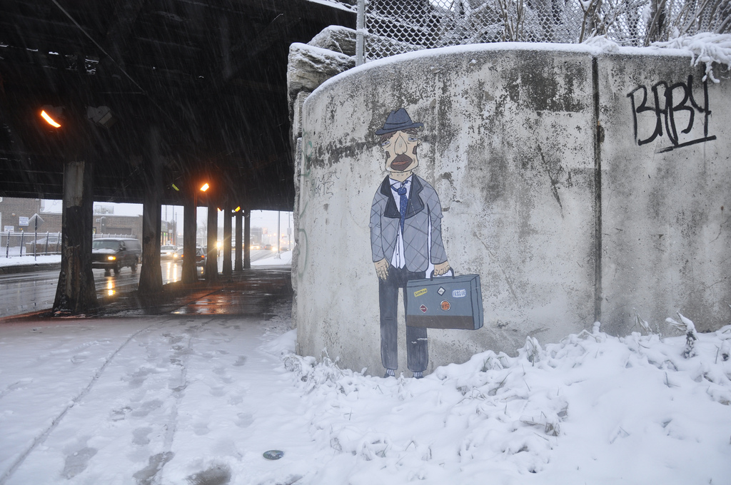 I was probably 14-15 and I was broke, and spray paint was banned in the city. So I would go to Walgreens and buy Magnum Sharpies and catch tags up and down Division St. That was the very beginning. Then in college I learned about wheat paste and started pasting a bit, and then after living in Brasil for a bit I came back to Chicago and started really pasting and working a lot, which led to bigger and more elaborate characters and situations for the characters to be in.