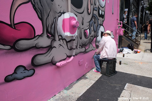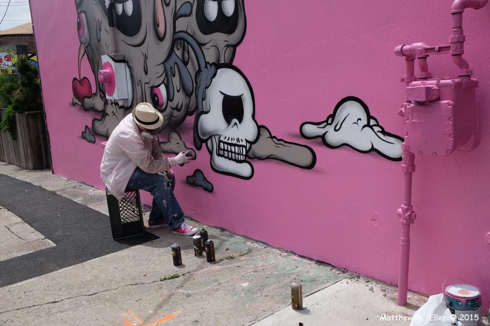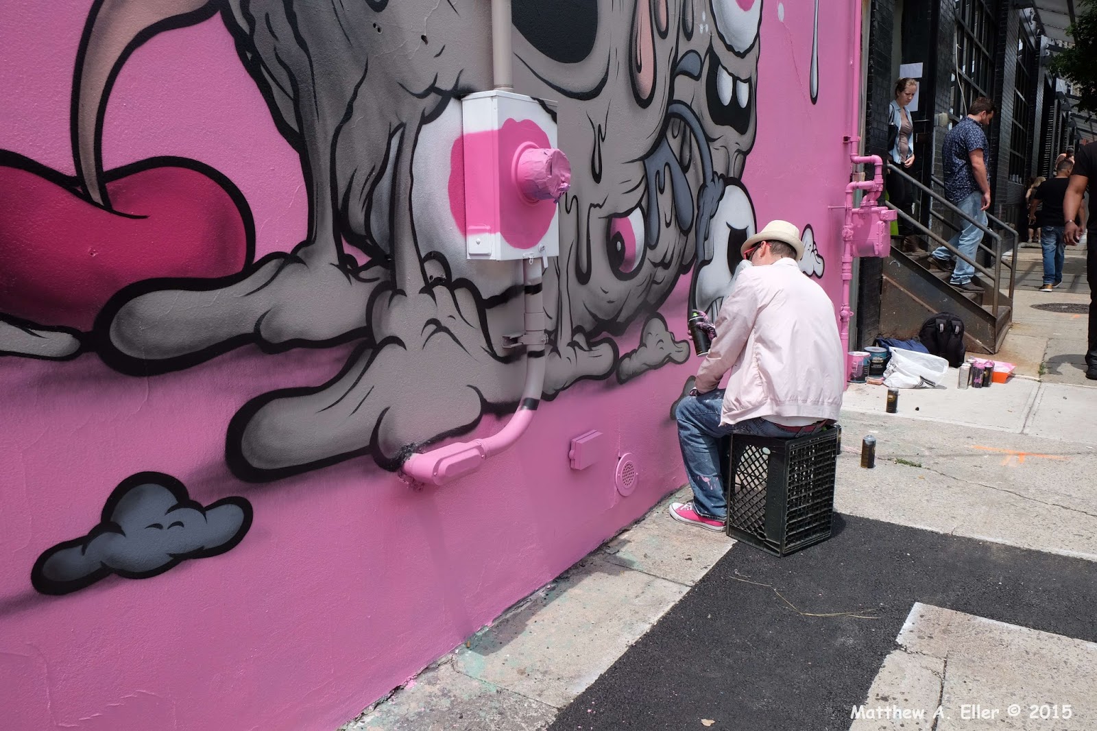 This past weekend was The Bushwick Collective’s 4rd annual block party featuring musical acts like Dj Evil Dee of Black Moon and Fat Joe who rocked the entire block while a plethora of street artists painted every usable wall surrounding the festivities. As always Buff Monster blessed the patrons by painting this new mural live. The American artist made a name for himself by putting up thousands of hand-silkscreened posters across Los Angeles, and other far-away places. His work is characterized by happy characters living in brightly-colored bubbly landscapes. Along with meticulously executed paintings, he has created a wide range of merchandise ranging from prints and stickers, to vinyl toys and plush. Check out the photos below!