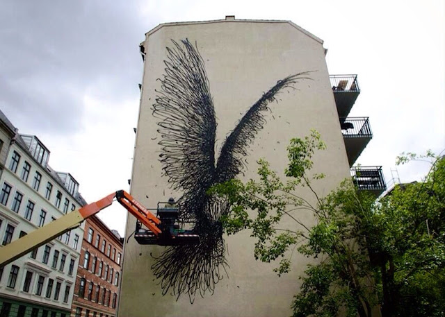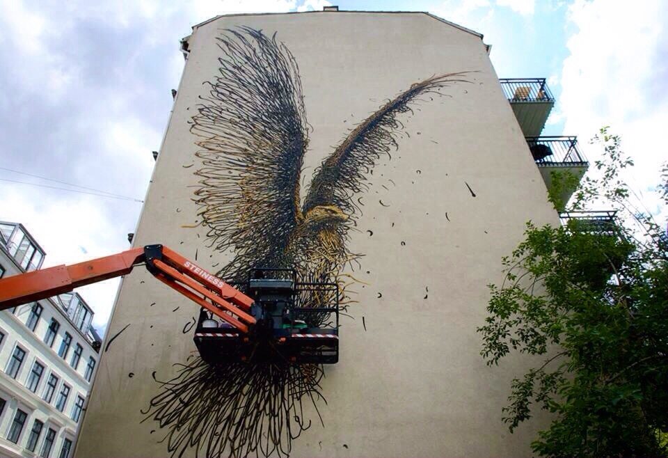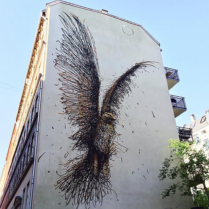 It took a few days for the Chinese muralist to create this outstanding depiction of a giant rusted eagle which was painted using his signature energetic line-work.