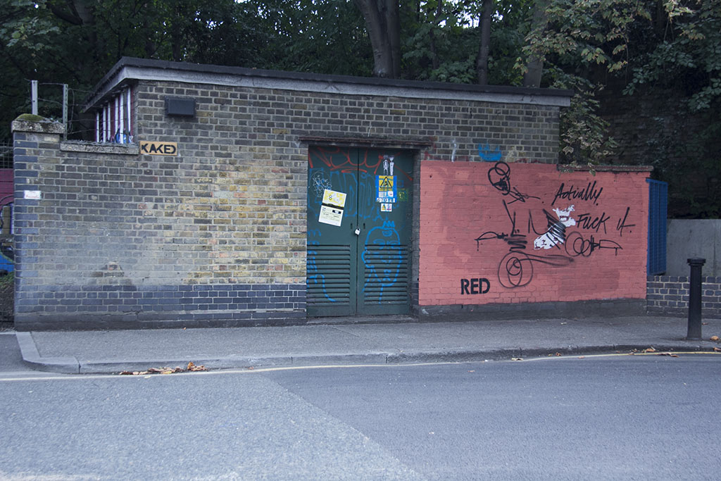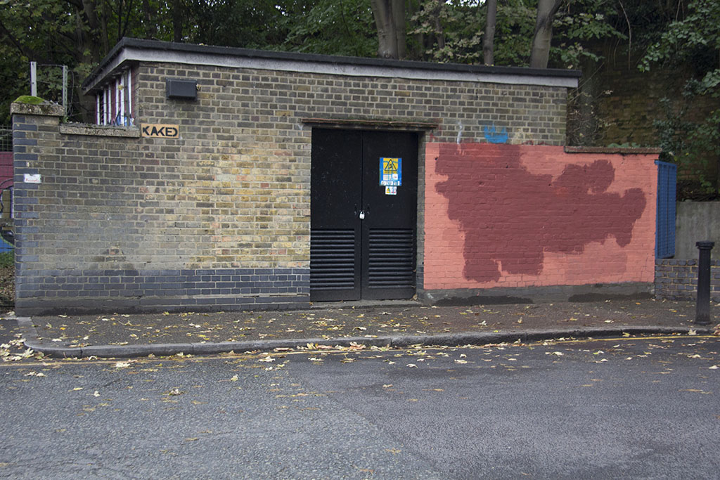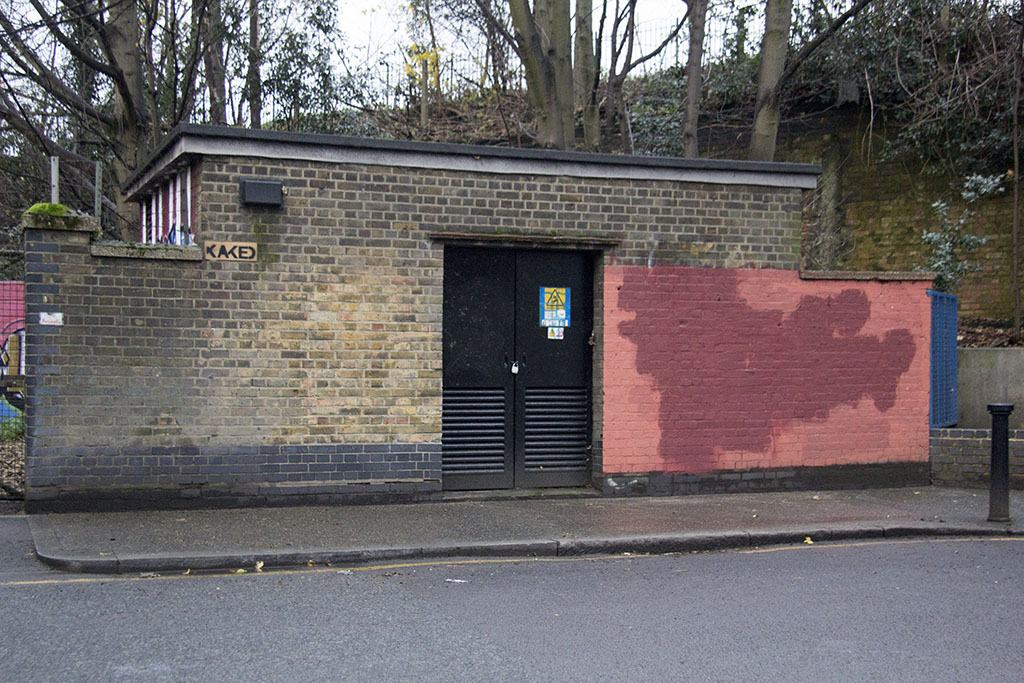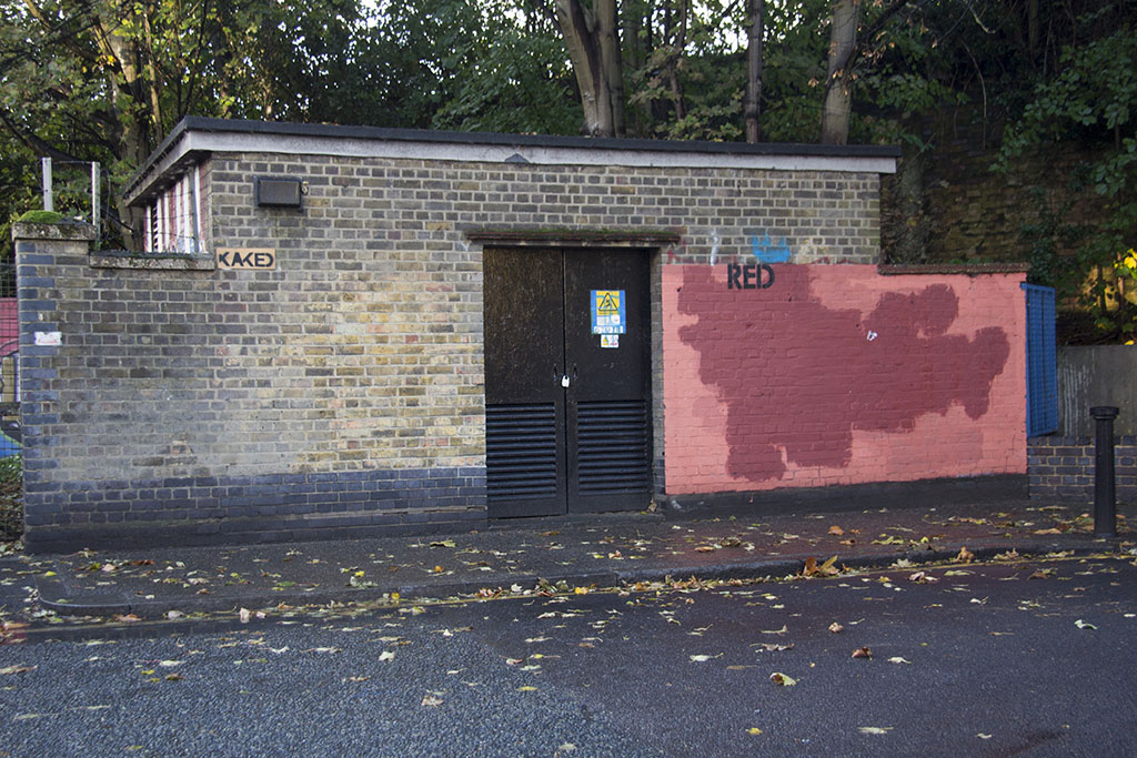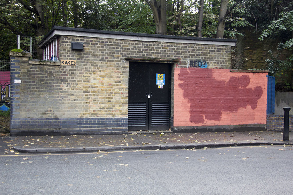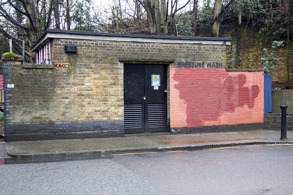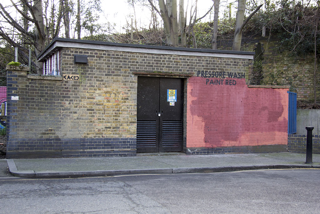I cycled past this wall on the way to work for years. I noticed that graffiti painted within the red area was “buffed” with red paint. However, graffiti outside of the red area would be removed via pressure washing. This prompted the start of an experiment. Unlike other works, I was very uncertain as to what results it would yield. Here is what transpired over the course of a year. –Mobstr