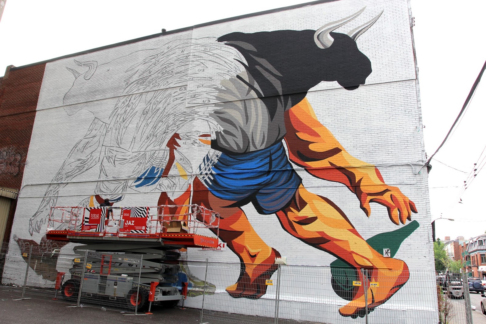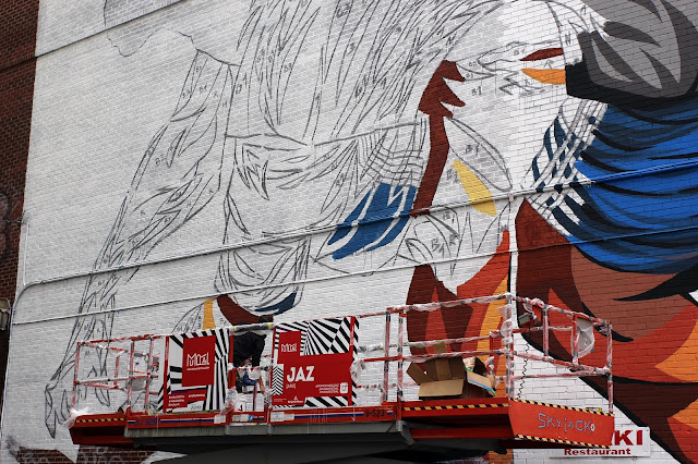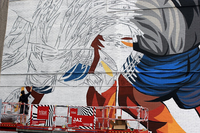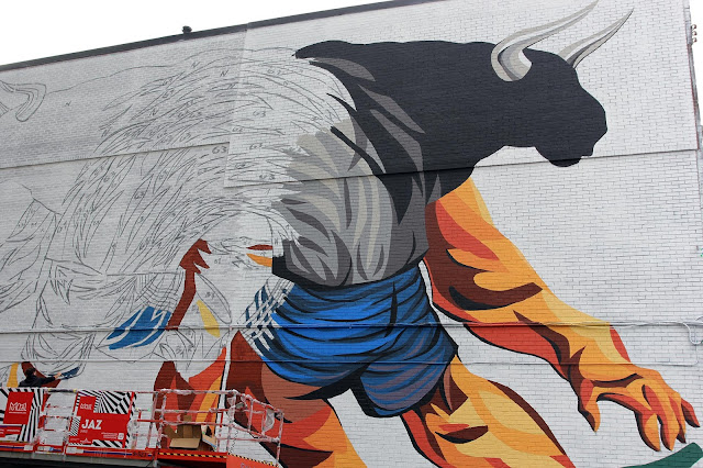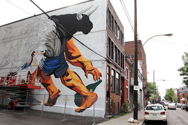 The Argentinean muralist will be painting for the next five days on this impressive piece which is featuring some of his signature imagery. If you are in the area, you’ll be able to find it on Napoleon and Saint Dominique.
