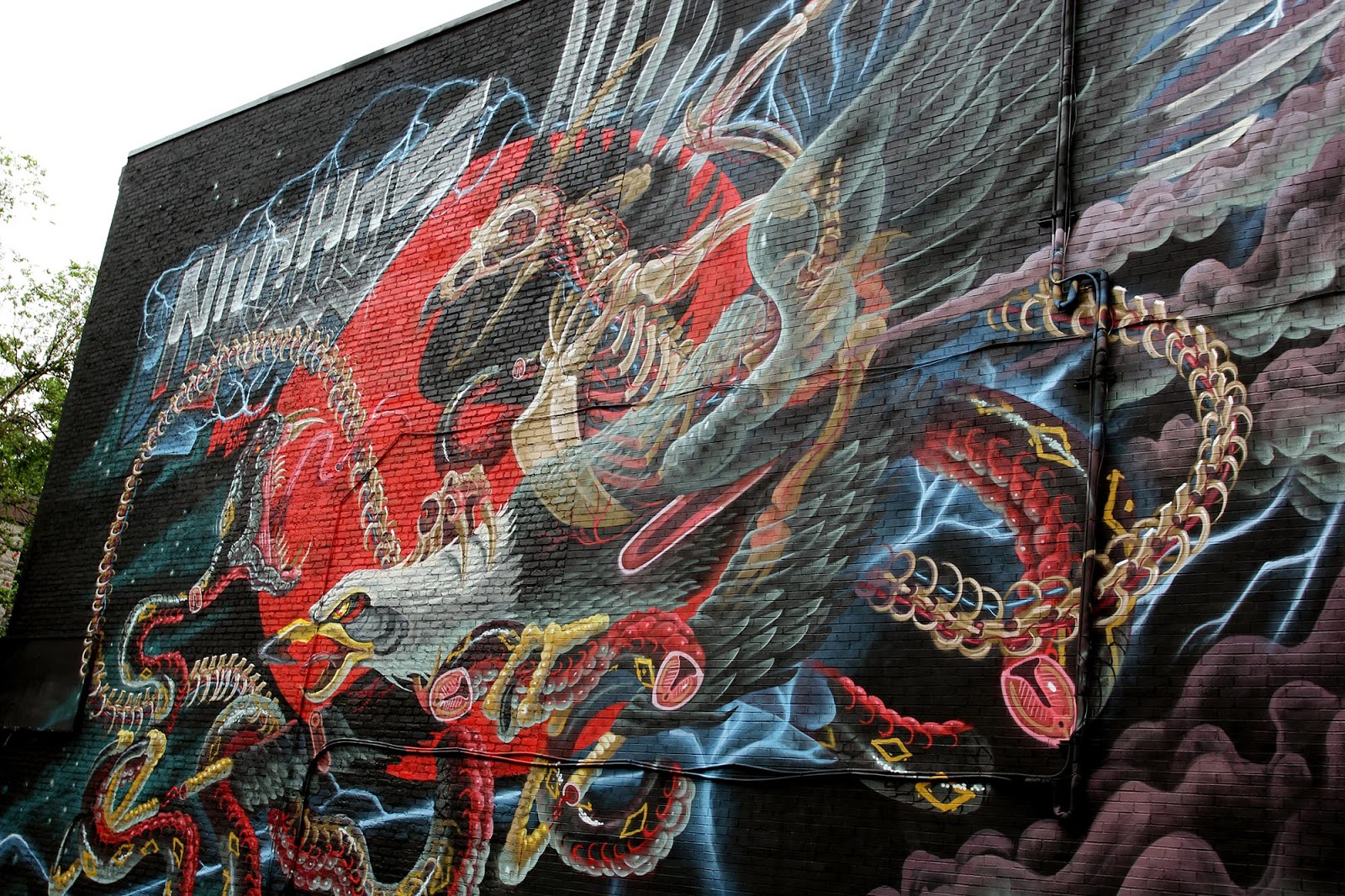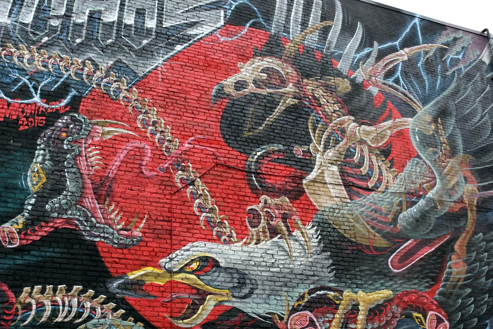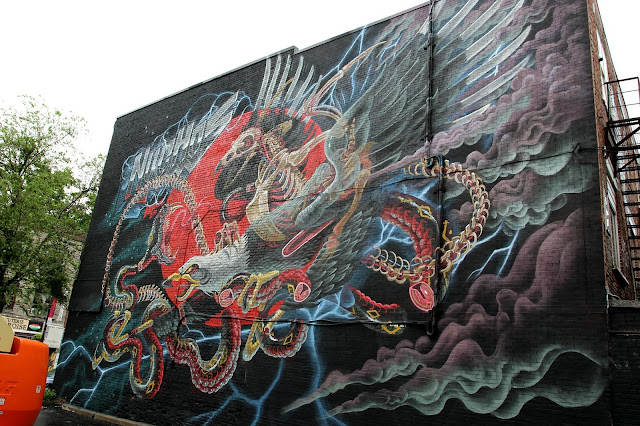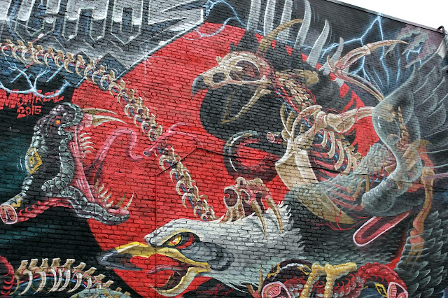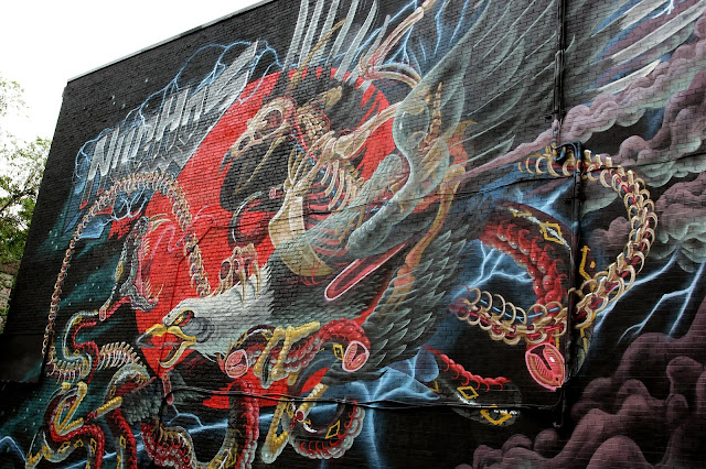 In town for Mural Festival 2015, the Austrian artist brought to life a rad new piece featuring some of his signature sliced imagery. This heavy-metal inspired piece feature all the goodies we know Nychos for! Rock on!
