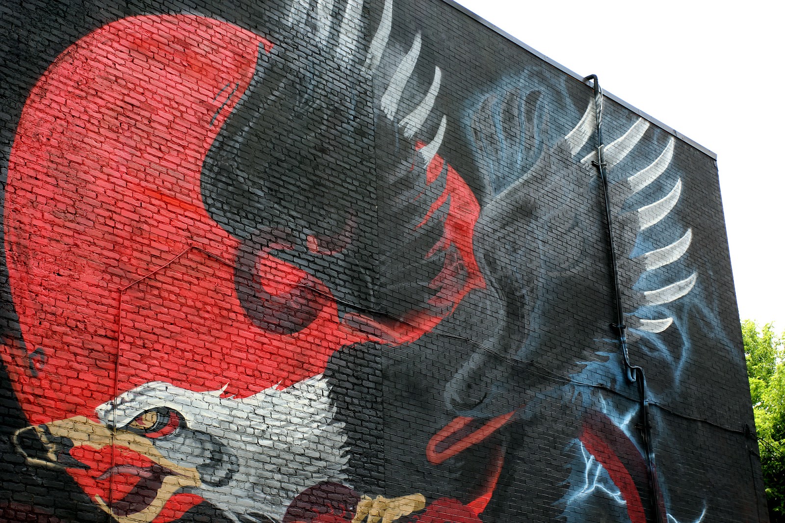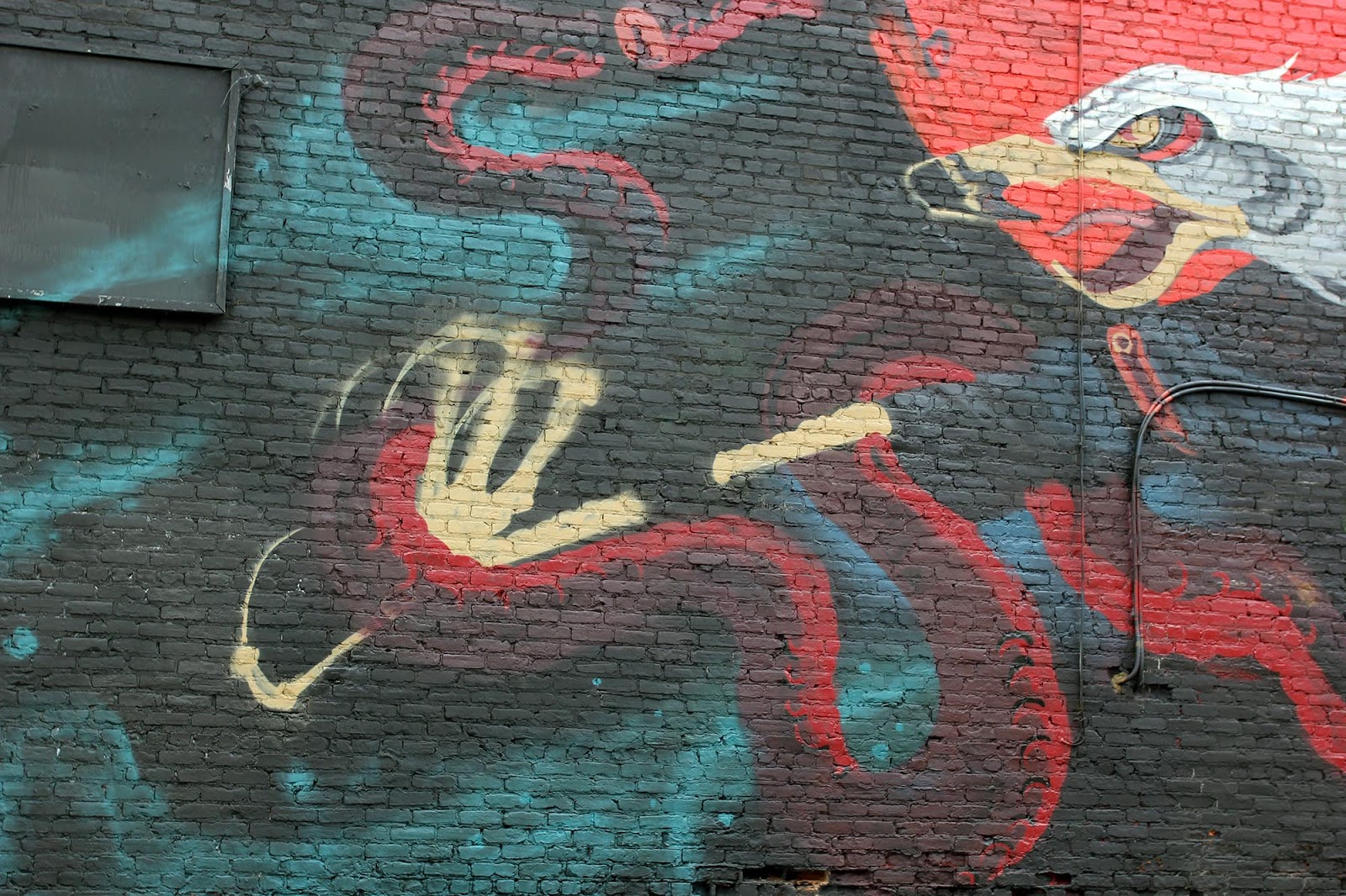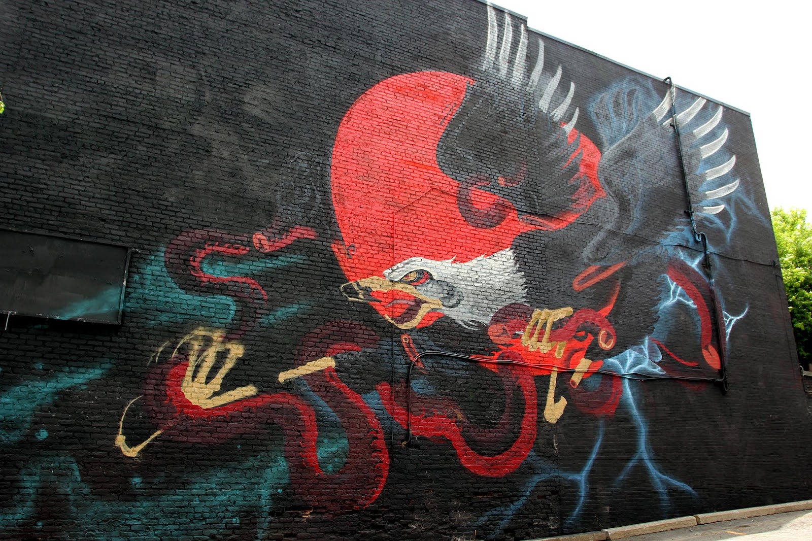 Painting on the busy Boulevard Saint-Laurent in Montreal, the Austrian street artist will bring some of his signature sliced imagery to the local residents with this giant depicting of an eagle battling up with a snake.