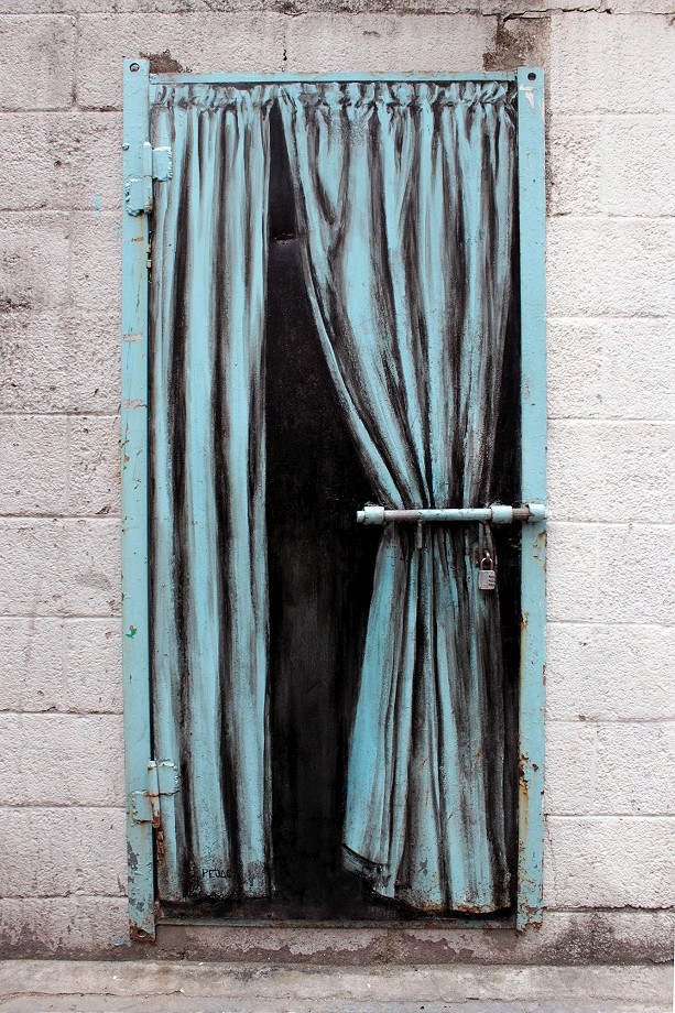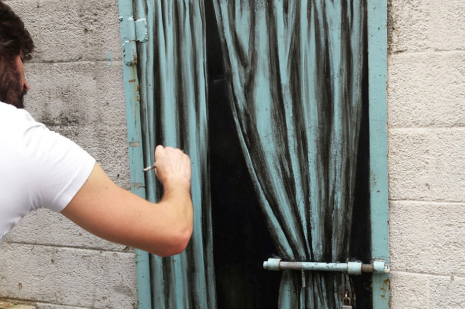 “Icarus” is a simple piece that is showing a shot down paper plane, burning as it falls to the ground. Through well measured painting intervention and clever placement, the artist created this striking piece that is a metaphor for a delicate political reality in the region. The 2nd piece “Oxymoron” was improvised on the spot, and is a great example of Pejac’s creativity and talent – painting on old iron door, using only black paint he created an illusion of a semi open curtain that is closed by a real metallic lock. This mix of reality Vs imagination comes even more obvious on two window drawings he did in his hotel room, showing a young girl on top of the highest mainmast, sailing into her imagination, as well as a helicopter carrying the sun around the earth. Aside from their visual appearance, all the works carry strong meaning and message which makes them even more special.