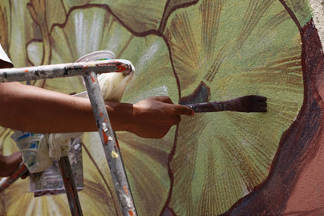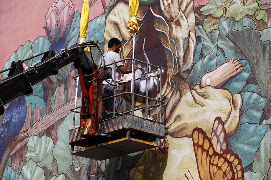 Marking a special moment in his life, the piece celebrates the miracle of bringing new life. Known for surrealist, emotive works that carry universal positive messages, this piece is no exception. Showing a big human-like flower carrying a new life inside a lush garden, the mural took 7 days to be completed. With colorful flowers, burning candles and monarch butterflies around it, the piece has a calming, almost meditating feel to it. Painted with brush and pastel palette, the finished piece feels very light and unassertive which adds to the complete experience.