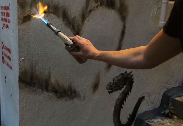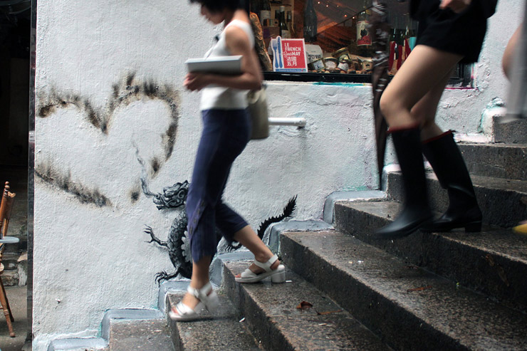 Entitled “Tagger” and located on Hollywood Road 97, the Spanish artist used a blow torch to create the heart and then carefully hand-painted the dragon with brushes. The dragon is a known symbol of strength and power in Asia and with this piece, he becomes a domesticated pet.