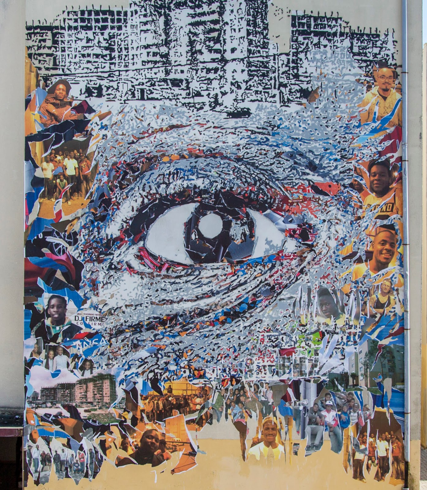This collective piece was realized with the participation of the community from its conception to its end creation. The artwork features several collage elements and some signature Vhils’ chiseled imagery such as the center eye.