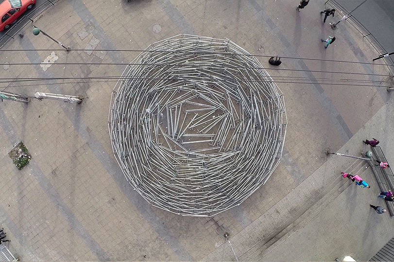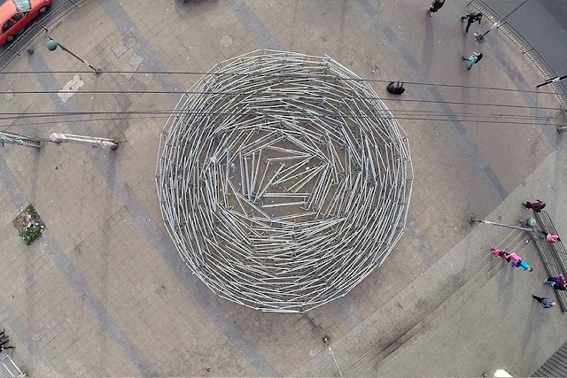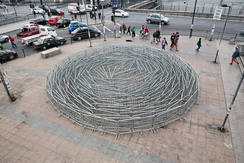 After a brilliant piece entitled “Crisis”, SpY is back with a brand new street installation entitled “Barriers”. The Spanish artist was invited in Santiago, Chile to create this piece of art which consists of a circle shaped formation made with pedestrian safety barriers. The installation was executed in a deprived neighbourhood of the city of Santiago. Simple yet ultra powerful.