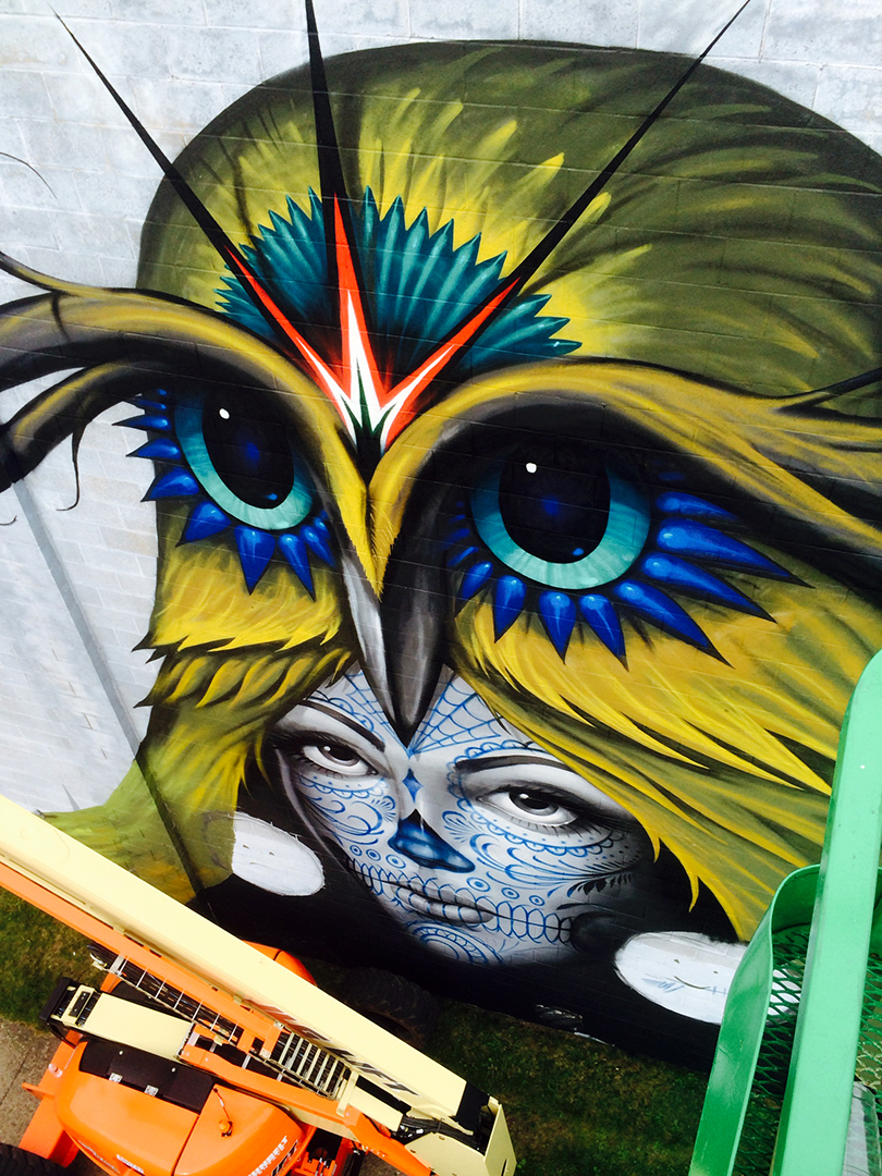 The Californian duo created yet another super piece of work which is featuring each artist’s distinctive style and technique. Soto’s haunting owl is combined with Maxx242’s Dia De Los Muertos inspired portrait.