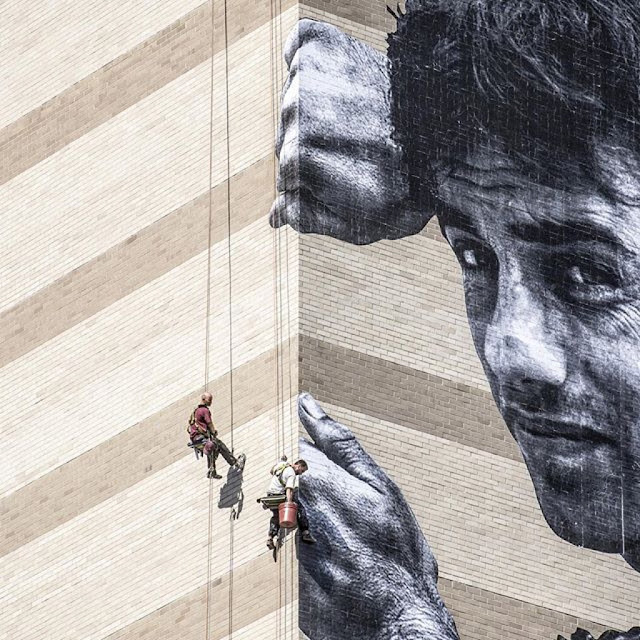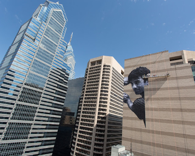 JR recently spent some time in Philadelphia where he was invited by the city’s Mural Arts Program to work his craft on the side of a enormous building.