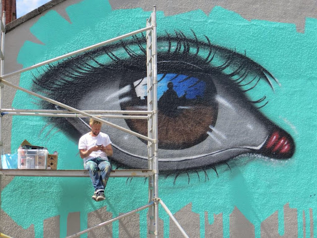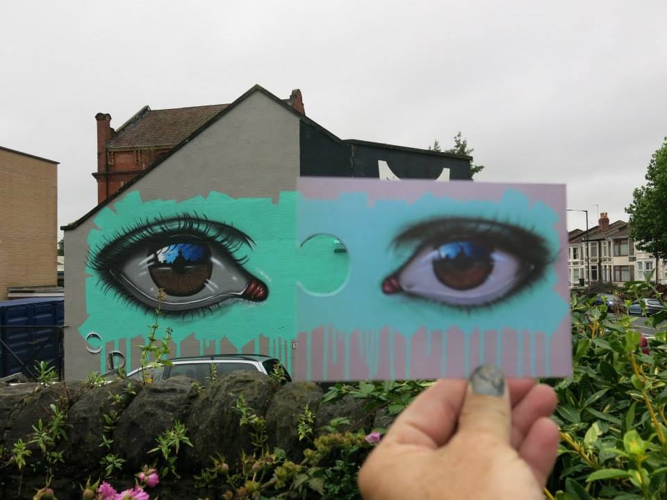 The British artist painted his trademark “set” of piercing eyes highlighted by a single band of color that intensify the cityscape reflections he hand paints into those deep orbs. The concept of the piece was that it was a pair or eyes made up of a single eye on the wall and a jigsaw shaped postcard that fitted to the wall to create the matching pair.
