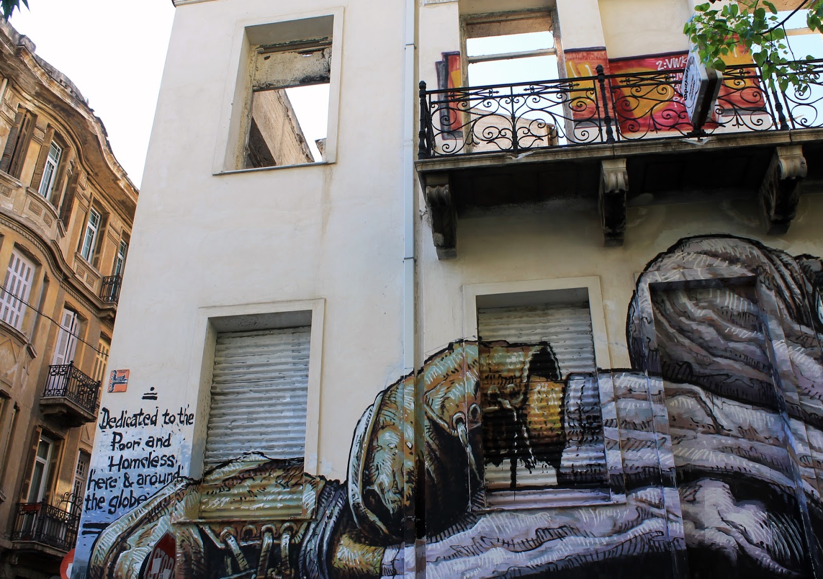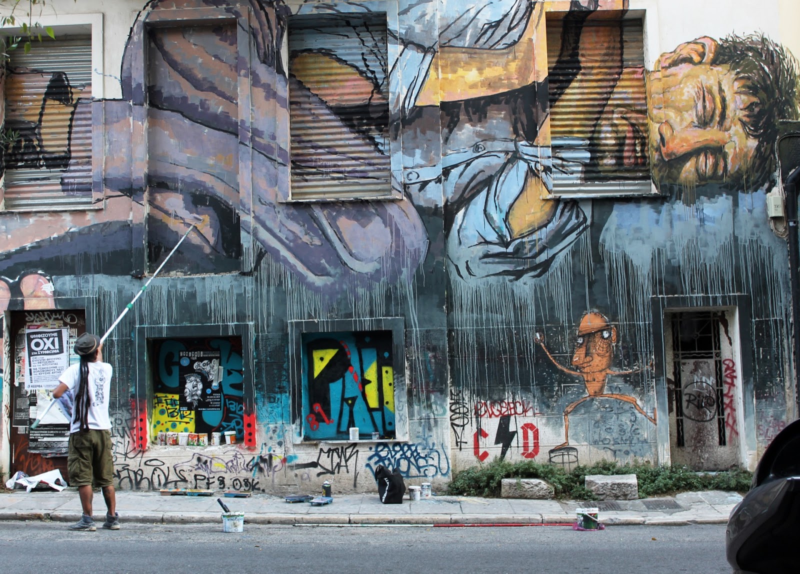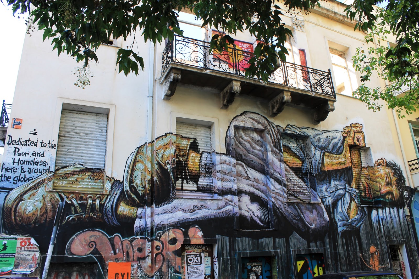 Geared with a telescopic extension roller pole, it took four days for the artist to complete this piece. The title is “No Land for the Poor”and is inspired by the Eurozone crisis and its impact on Greek people. The piece is dedicated to the Poor and Homeless in Greece and around the globe.