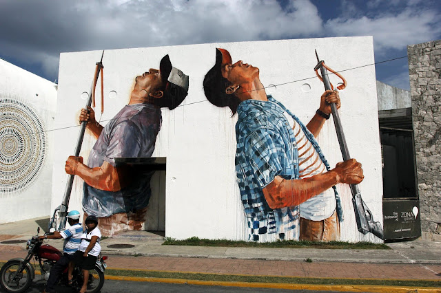 Entitled “The Spear Fisherman”, This mural depicts, as the title states, two local spear fisherman. Since an invasive species of lion fish has arrived in the Caribbean it has caused extensive damage to the coral reefs that surround the islands. Mexico now has opened up a number of of its national marine parks to fishing on the proviso that the fishermen only catch the lion fish and only use spears to ensure other native species are not harmed by the fisherman. The program has seen a dramatic decline in lion fish numbers. The spear fishing practice has also become a local staple of the fishing economy with lion fish being served in most restaurants and now being exported to the U.S.