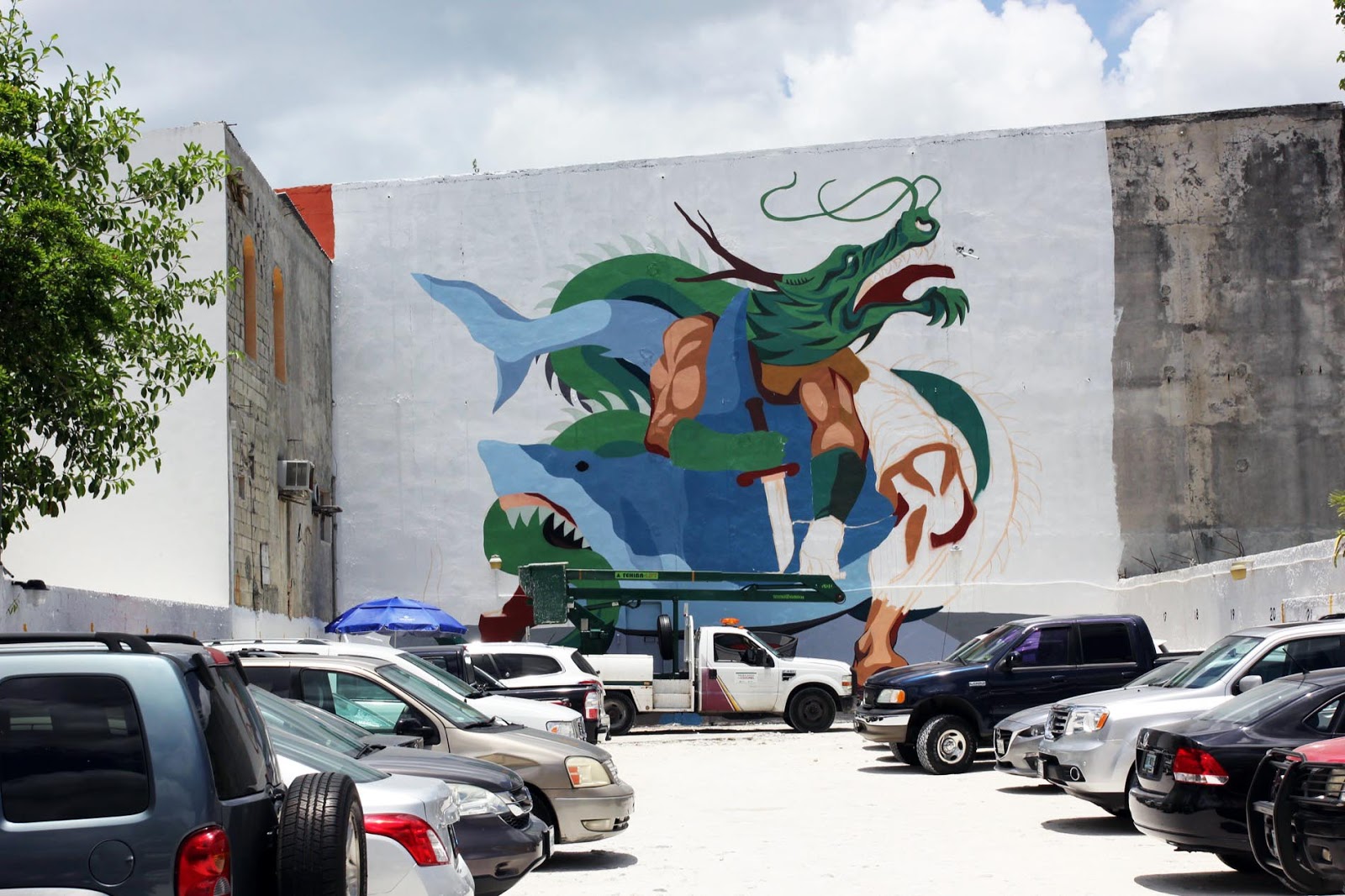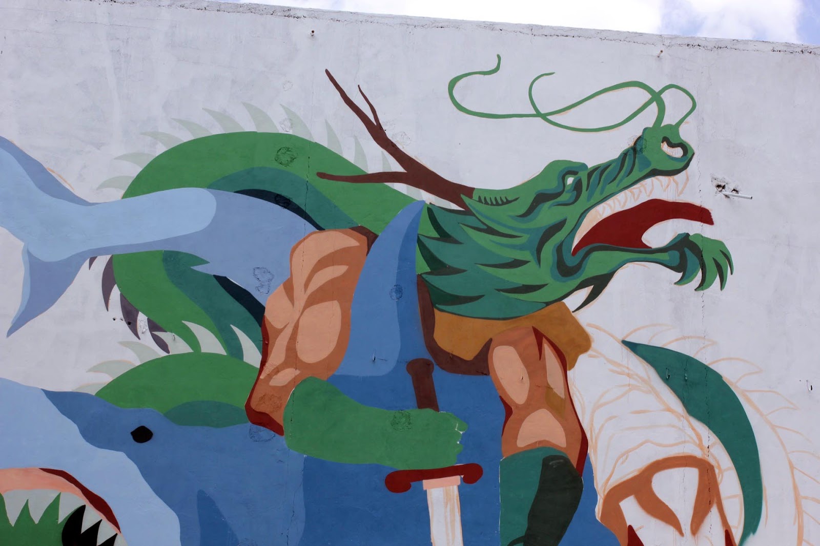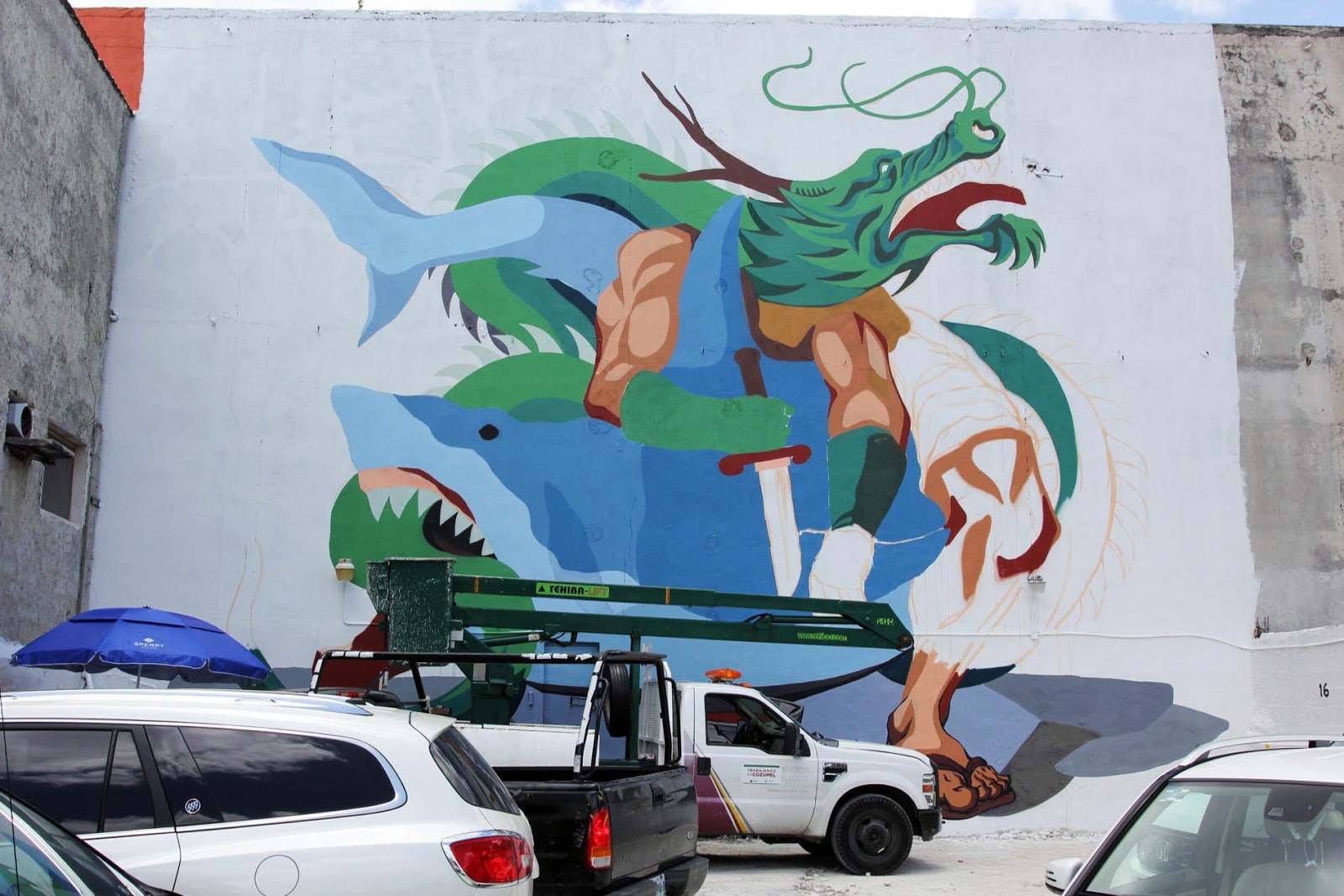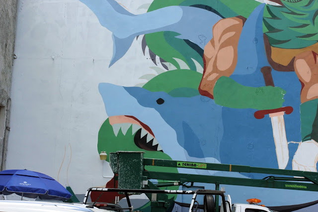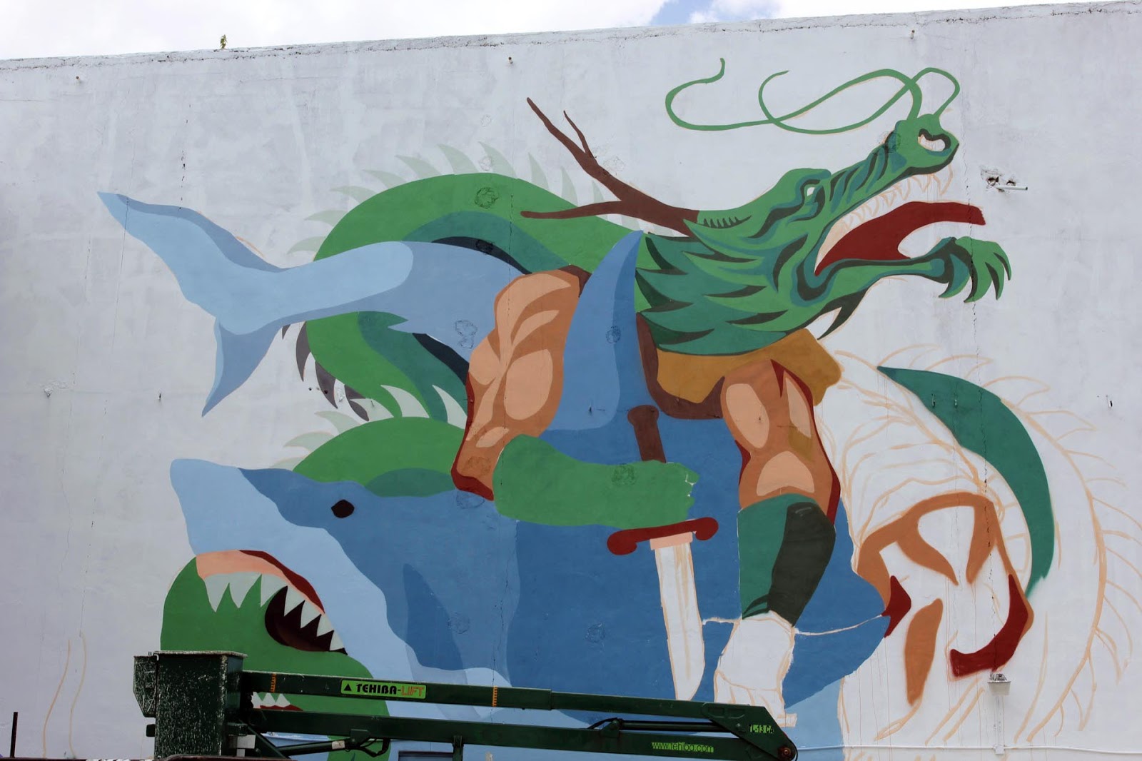 Painting on the streets of Cozumel, the Argentinian artist is currently working on a very large piece showing a dragon fighting with a shark. The theme for SeaWalls this year is global warming and this reflects into JAZ’s artwork.
