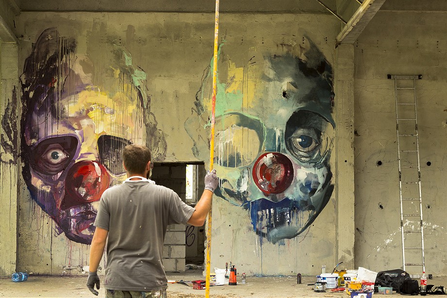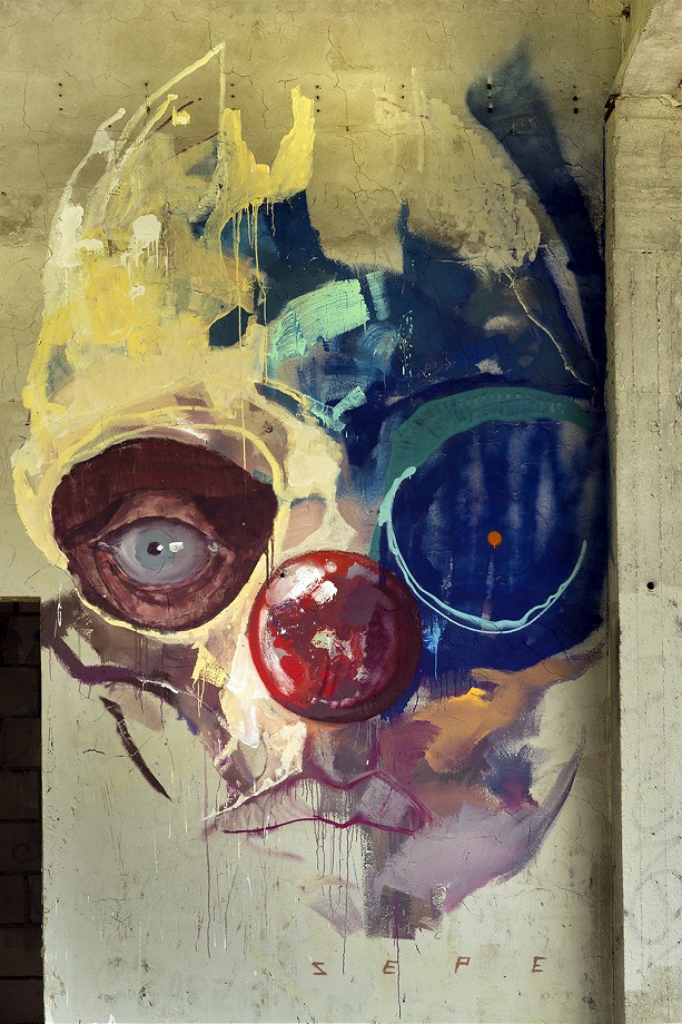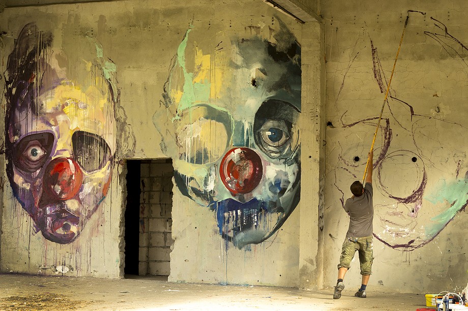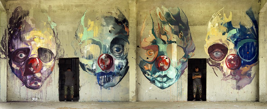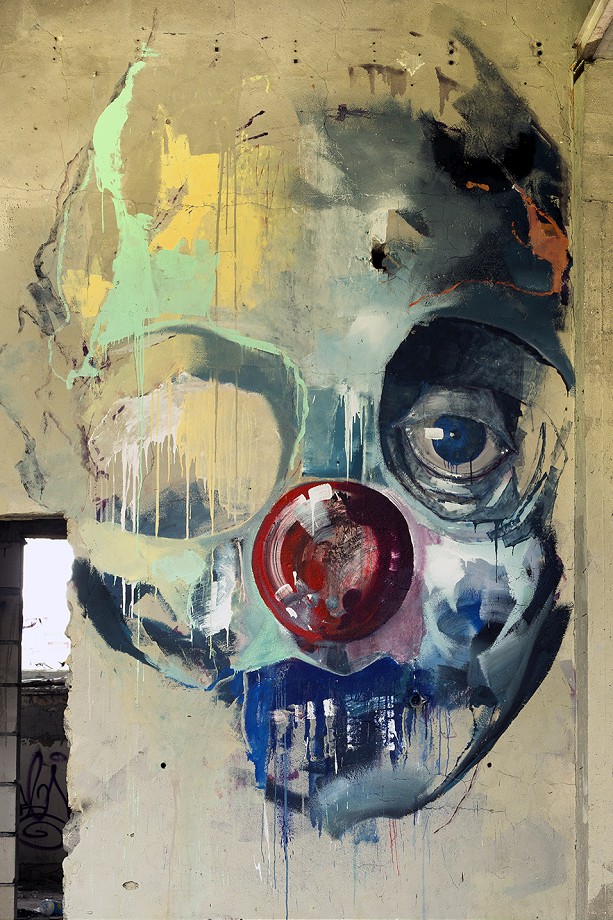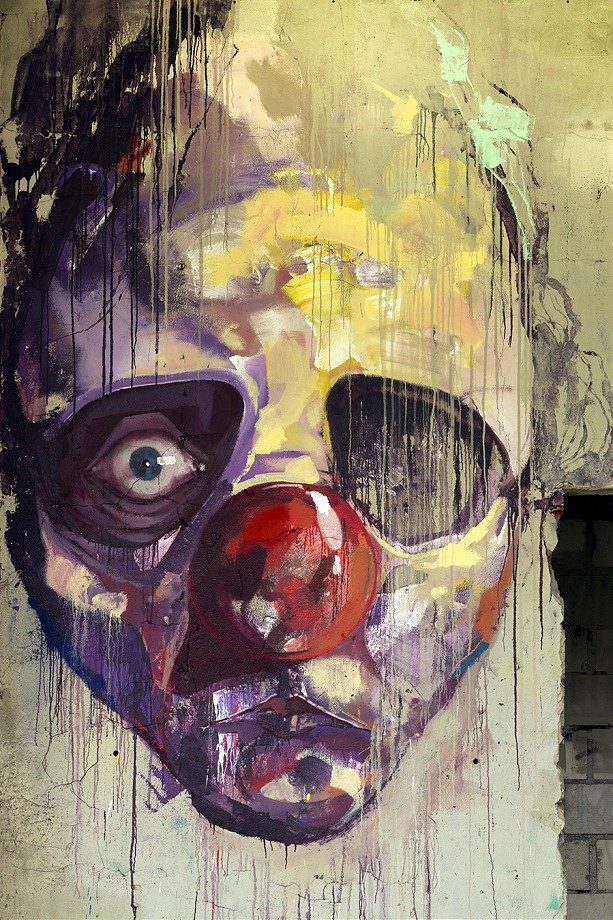 “The Further You Go..” is a continuation of his mural he’s done at the same place for the show opening, and it is consisting of 4 portraits. Both colorful and pale, haunting and funny, realistic and expressive, sharp and drippy, the faces are the epilogue to his “The Golden Age Of Grotesque” show. With red nose as one of the leitmotifs of his latest works he’s been creating, these faces are an example of slightly new direction hes been moving to.