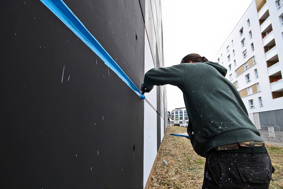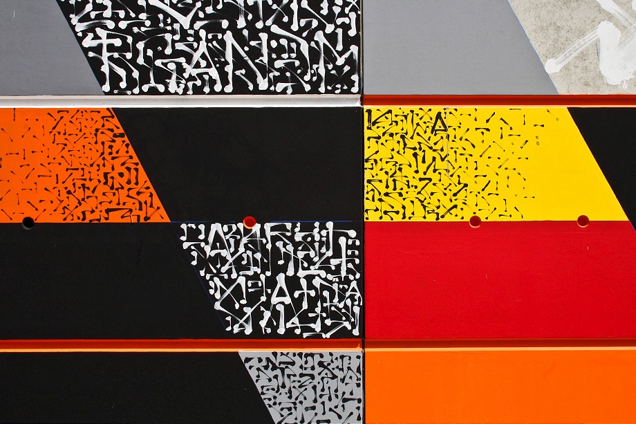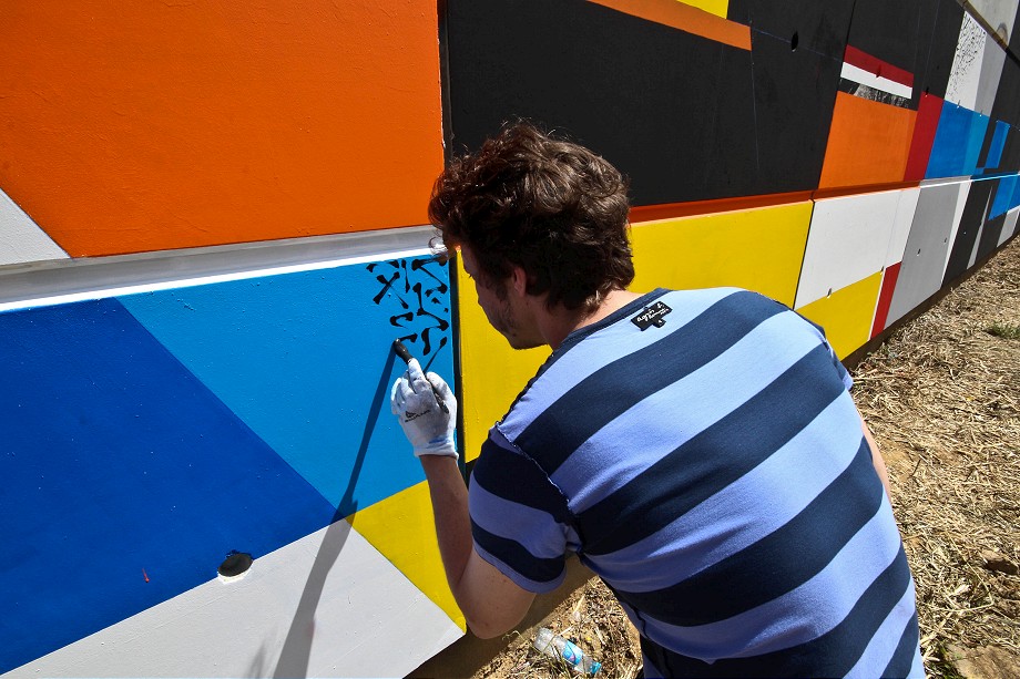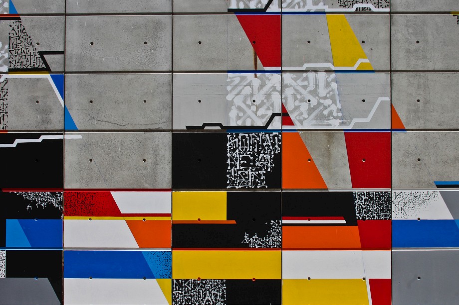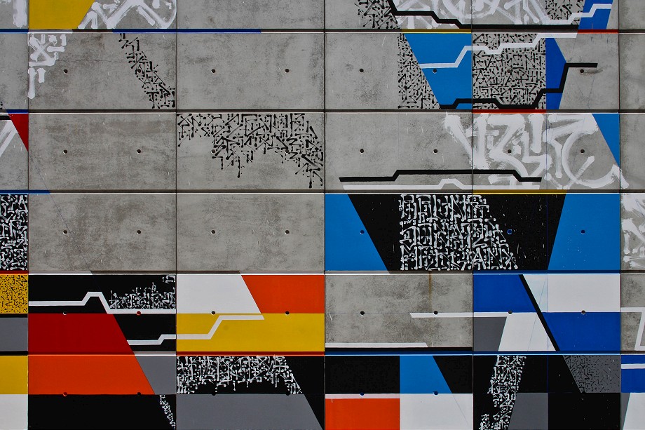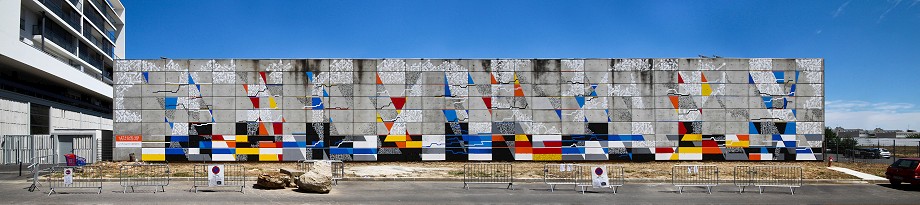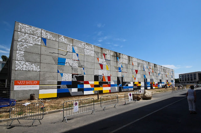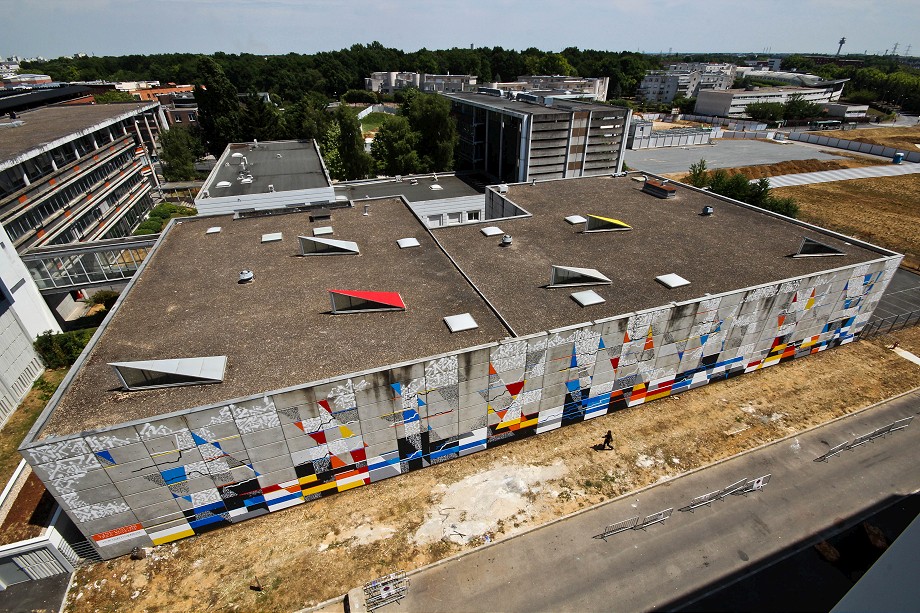 This unusual, abstract mural is consisting of Lek’s & Sowat’s signature elements such as lines, geometric colorful or abstract shapes and repetitive calligraphic symbols. The artist’s idea was to create sort of a tribute to the colossal wall paintings that flourished in the 70s along France’s freeways and tunnels. Along with painting the large wall on the side of the local college building, the artist included the roof elements into this masterpiece of street art.