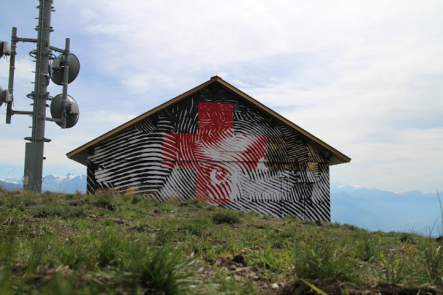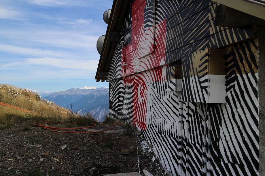 Andrew Antonaccio & Filio Galves from 2Alas just finished their piece for the great Vision Art Festival that is now happening in Crans-Montana in Swiss Alps. The duo picked a lonely hut on the cliff and painted their vision of a Swiss mountain shelter.