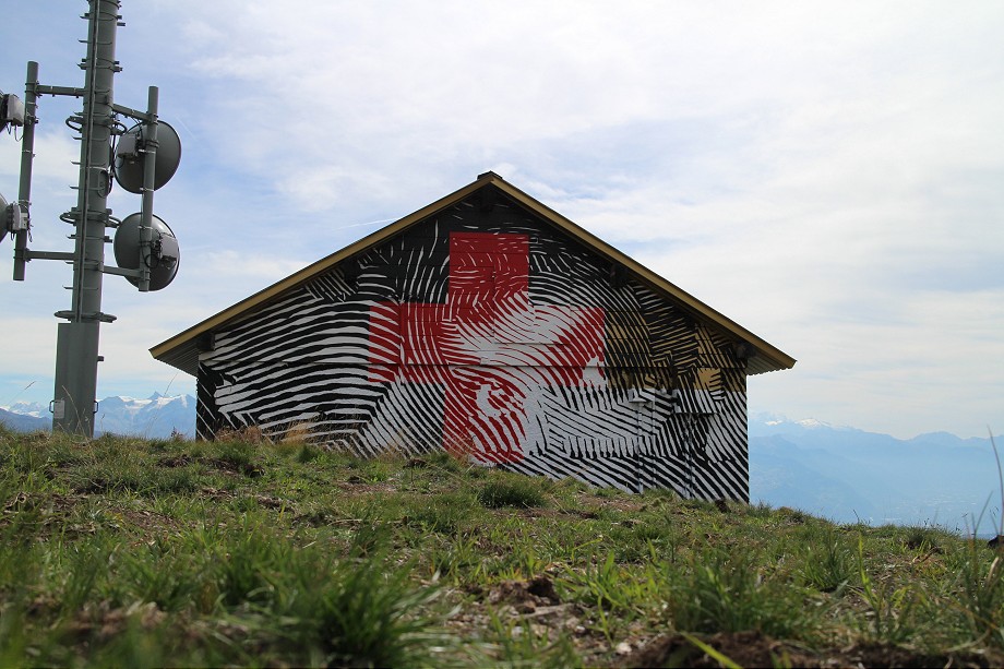 The piece is based on a photograph they composed especially for this work, and the result is super effective. Placed in an amazing setting on almost 2,500m above sea level, the due decided to pay a tribute to the motherland of Red Cross. Using their signature linear style, the artists painted the entire surface of the building including the pickaexe or first aid box. Using only black, white, red and gold, 2Alas created a striking piece that can be seen just bellow Cry D’ere station.