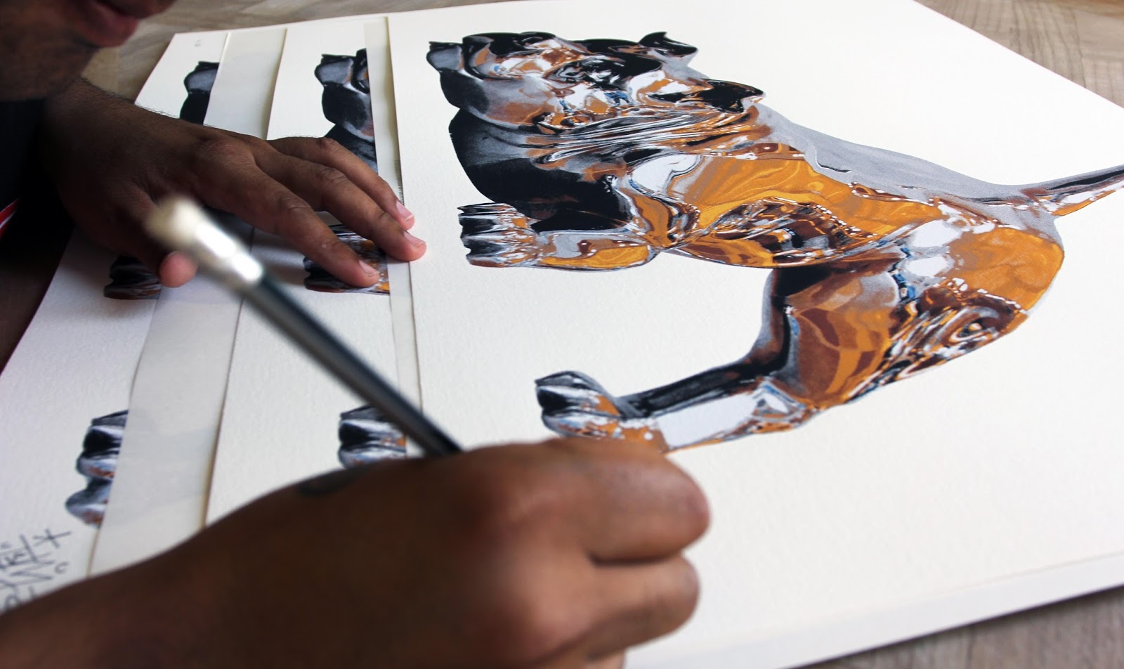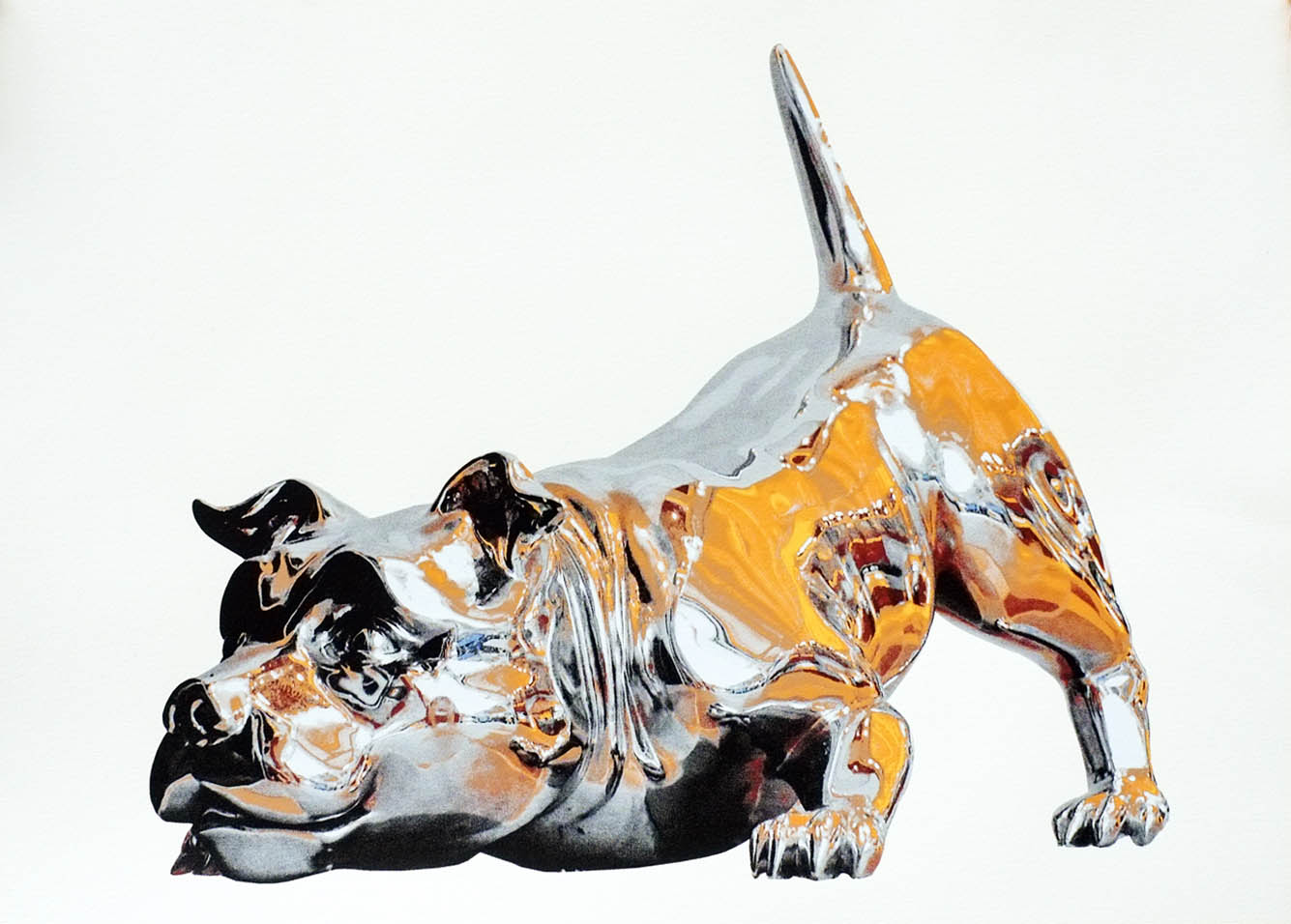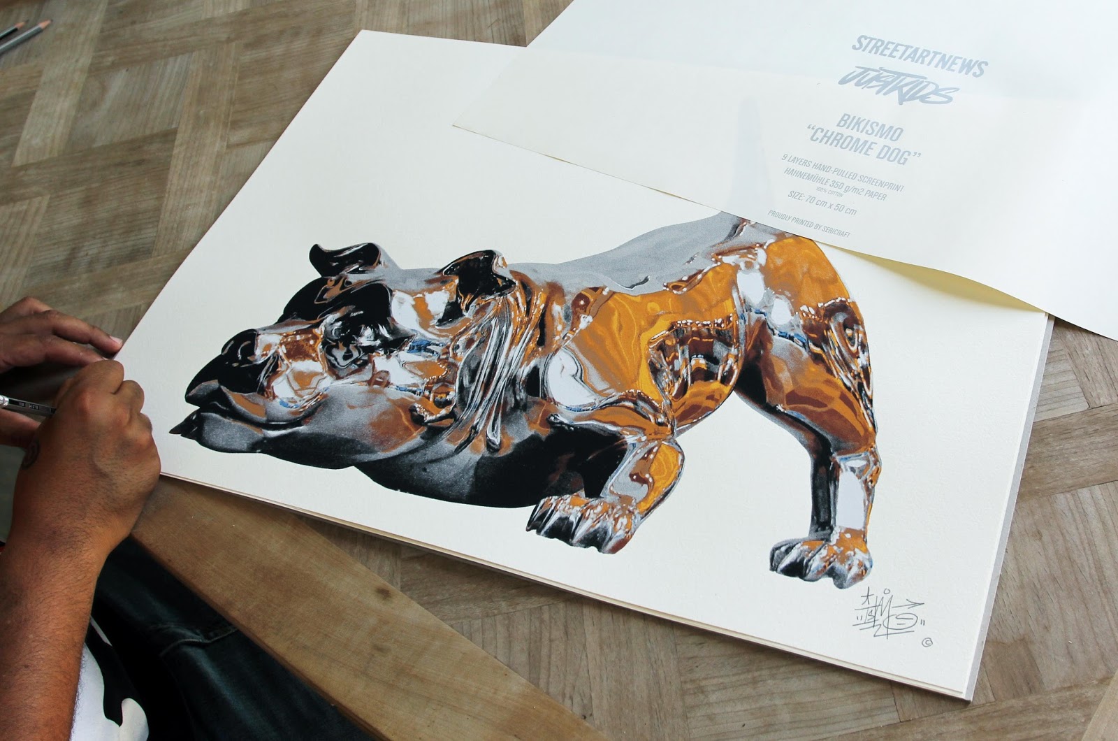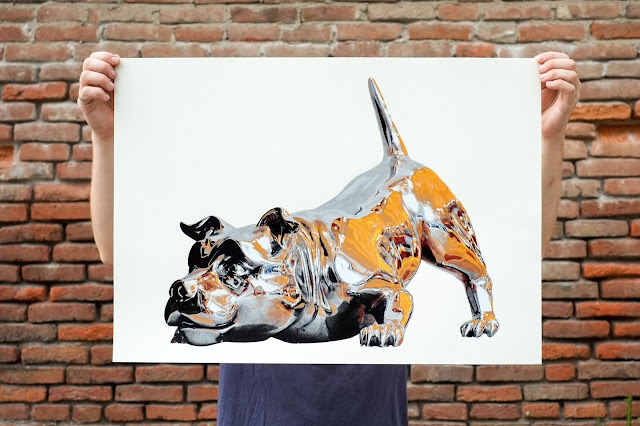 Puerto Rican street artist Bikismo created a stunningly photorealistic chrome dog mural for the Raw Project at the Jose De Diego Middle School during the latest Art Basel Miami. The street piece took about four days and was painted entirely with spray, reflecting objects and scenes from the surrounding area giving an incredible 3D feeling.The artist worked in collaboration with JustKids and us to create this screen-printed version of his most famous artwork. After several weeks of trial and error, we are proud to present what may be our most complicated screen-print to date. The artwork is called “Chrome Dog” and it’s simply stunning to look at.“Chrome Dog” is an edition of 35, it measures 50 x 70 cm, nine layer hand-pulled screen-print on super fancy Hahnemuhle Cotton paper and it comes signed and numbered by the Puerto Rican artist.“Chrome Dog” will be exclusively available via the StreetArtNews’ store on Thursday, August 27th at 5PM UK for £115 each.