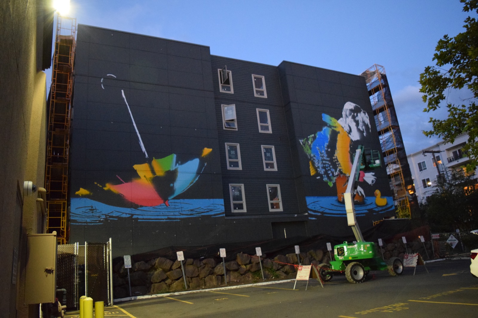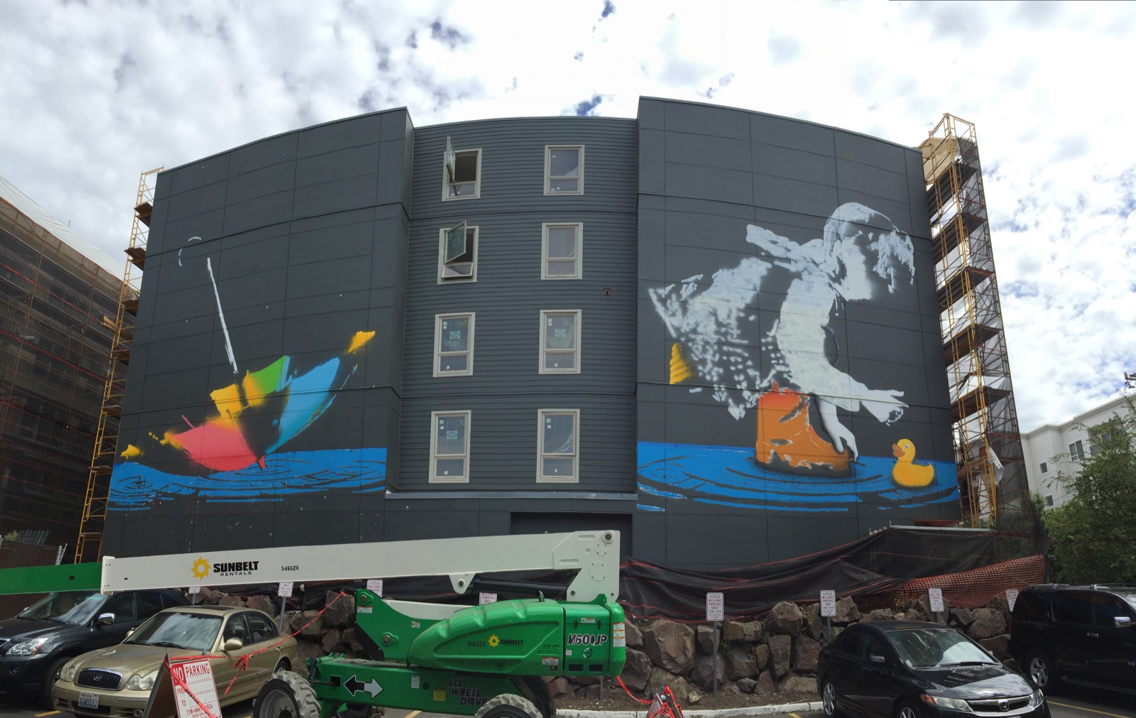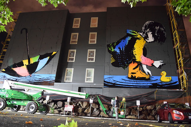 The Los-Angeles based artist spent a few days up high on his cherry picker to create this mega-artwork showing a young girl playing in a water puddle. As usual with Bumblebee, his artworks are most of the time showing young playful children.