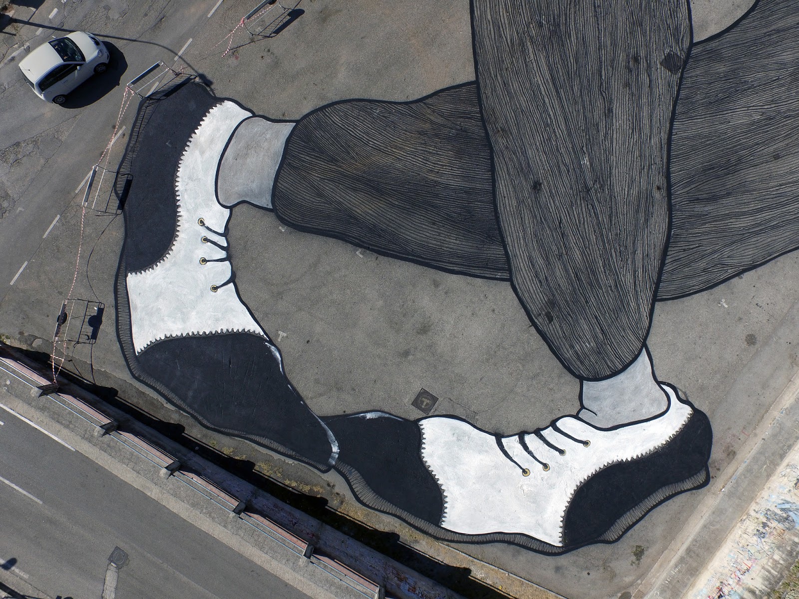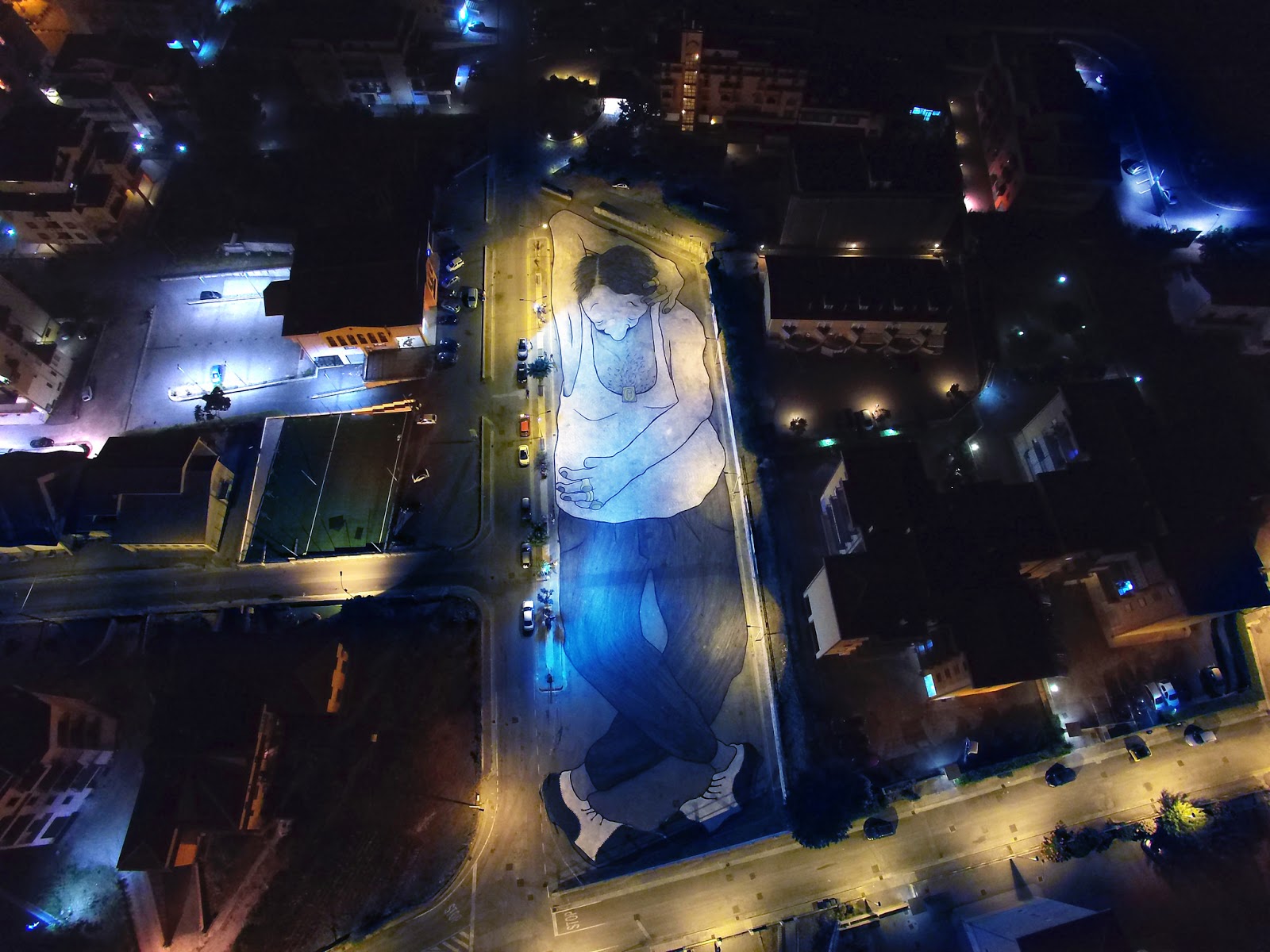 The French street art duo brought to life one of their signature super-sized characters taking a nap on a parking lot. As usual, their technique is unique and mighty impressive.
