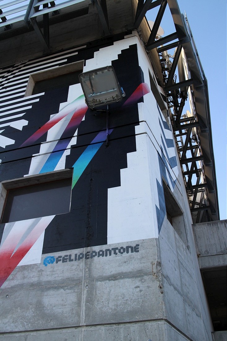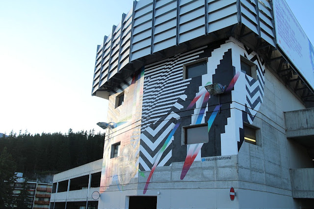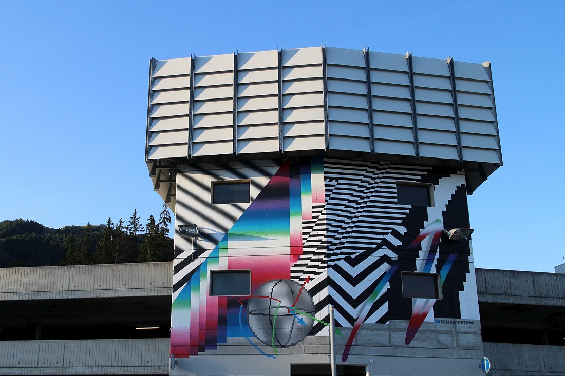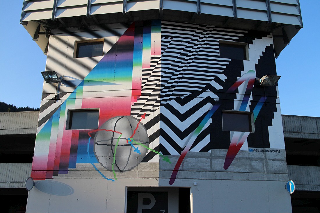 Another artist that quickly worked his way through his piece for Vision Art Festival in Crans-Montana in Switzerland, is Felipe Pantone. In matter of couple of days he finished this unusual, detailed piece at the parking lot on Route des Téléphériques in Crans.