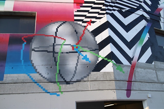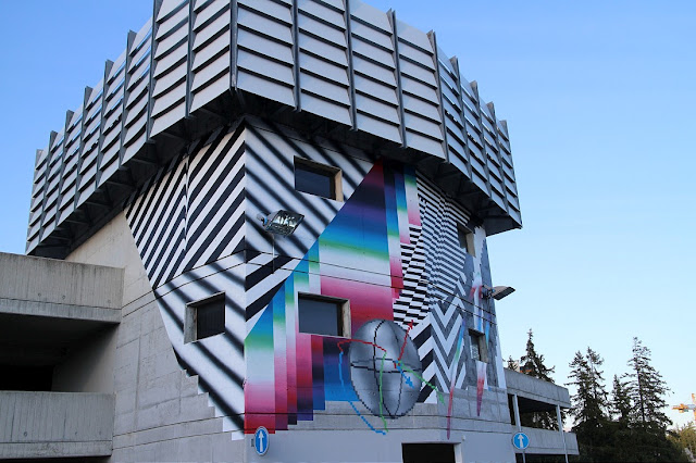 In his signature style the Spanish artist painted sort of a visual distortion image consisting of black/white patterns and macro views of color spectrum. To add the emphasize the effect of distortion, he added couple of pixelated object rarely seen created in this manner on walls. His bold, retro futuristic graphic elements, especially the black and white grids are complemented greatly by the rooftop of the building, but also, contrasting nicely with the fairy-tale like landscape of the Swiss alps around it.