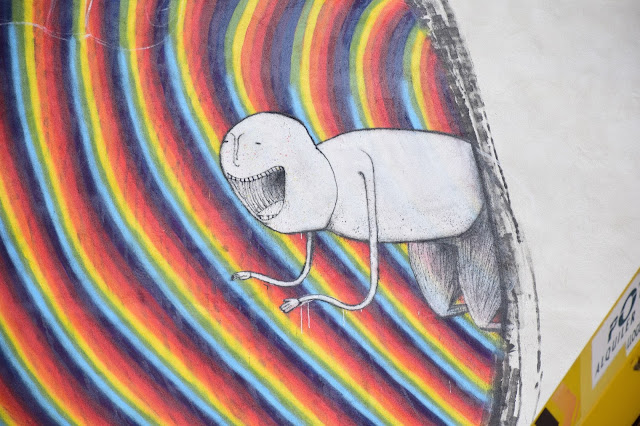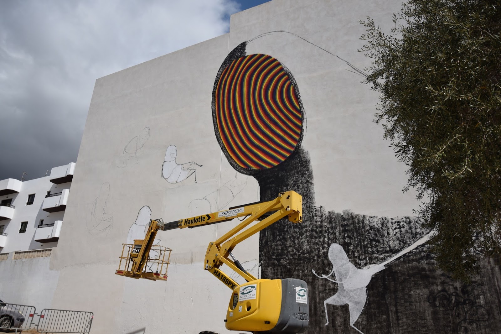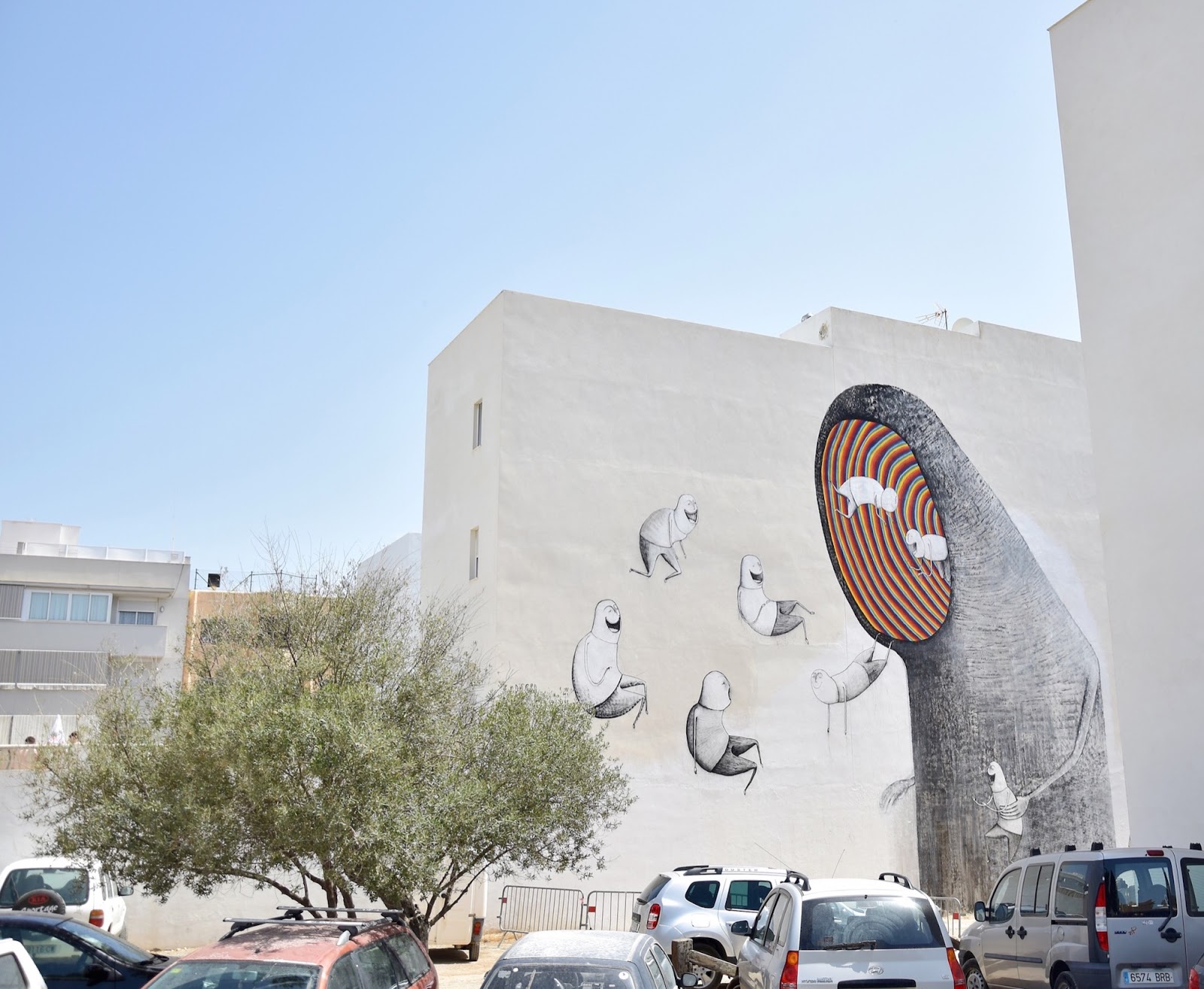Painting on the streets of Sant Antoni, the Belgian street artist spent a few days working on his cherry picker to create this trippy artwork showing some of his unique characters interacting with a larger and faceless creature.
