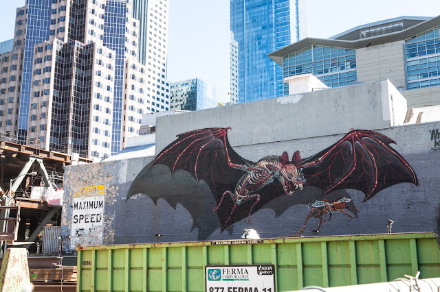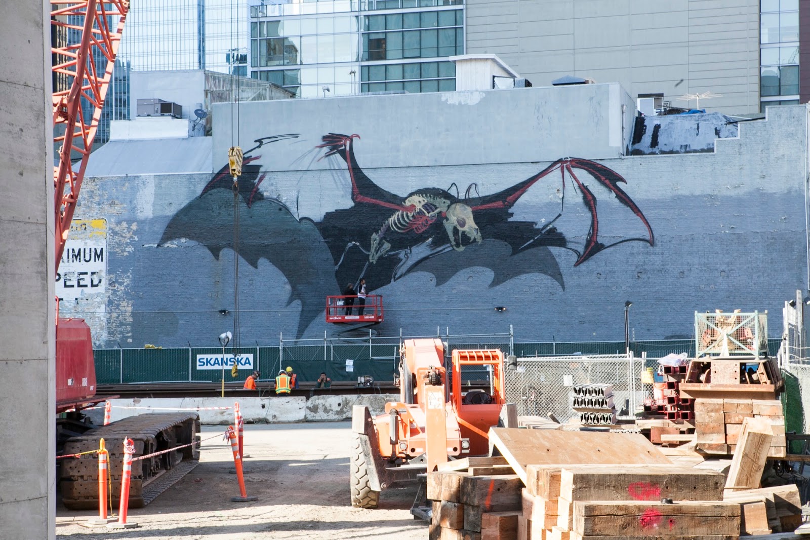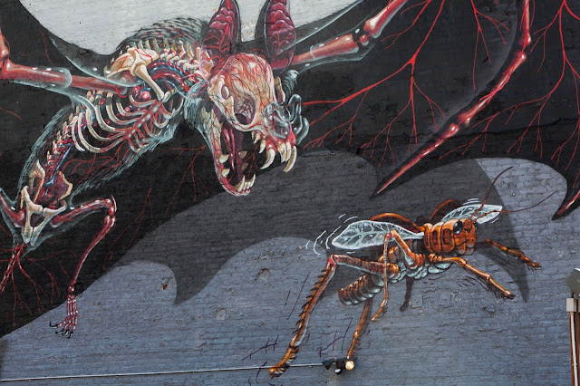 The Austrian surgeon brought to life a super-sized bat in his signature style showing the beast’s insides and bones structure. The bat is about to prey on a cute insect which has also been dissected by Nychos.