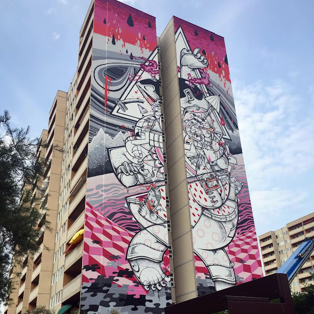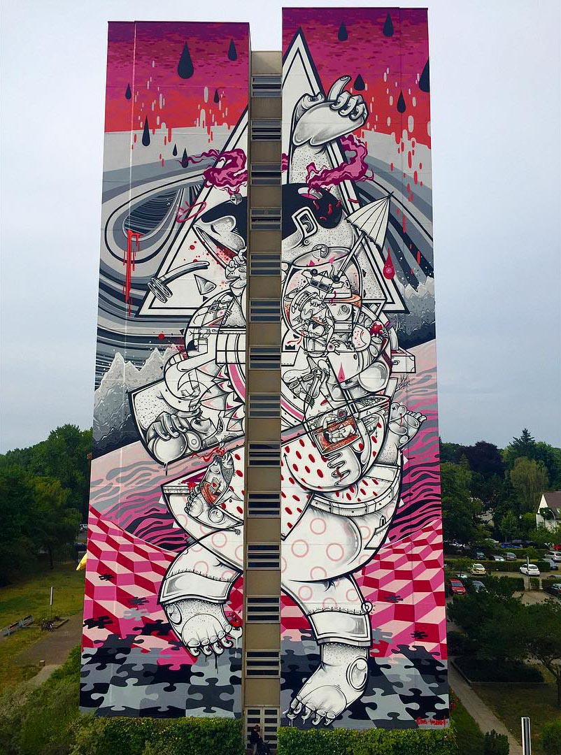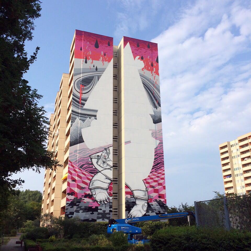Organized by our friends at Urban Nation Berlin, this massive piece only took seven days to be completed by the New-York-based artists. The red, black, and white-based imagery is instantly recognizable and commands attention through the impressive size and the intricate detail. The piece is entitled “On Tiptoes”.
