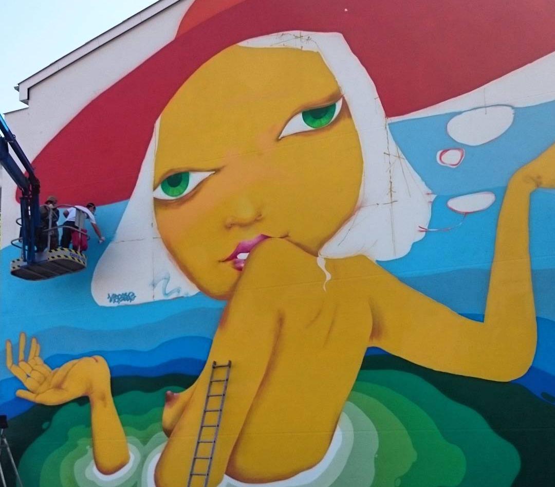 Painting on the streets of Næstved, the Brazilian superstars spent a few days up high on their cherry picker to create this beautiful piece depicting a large-scale rendition of a rather sexy woman. She is holding in one of her hands, a tiny boat which is hosting one of Os Gemeos’ signature characters.