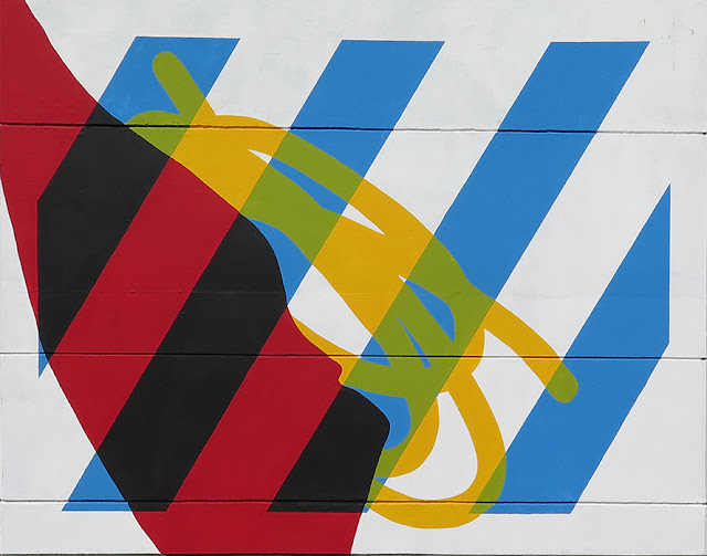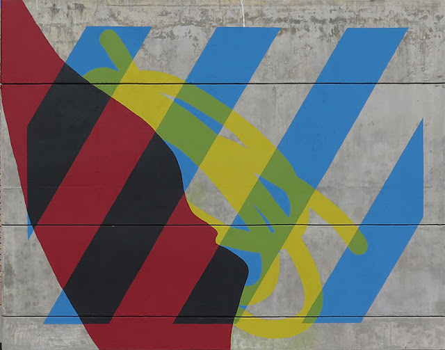 As always, let the environment be part of the main characteristics of the artwork, on this case, all the chromatic developing, is modified by the different backgrounds. We can see the piece on the left with super brightness colours and white on the back. On the right the saturation is less than her sister piece, because all the colours loose sharpness with the concrete, and this dirty gray start it become part of the artwork.