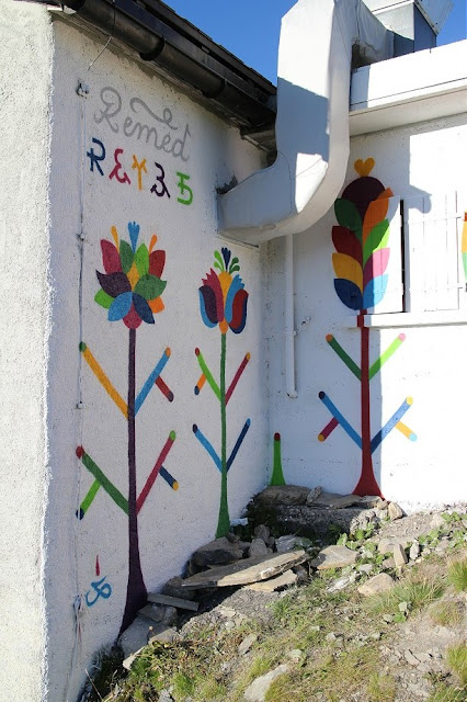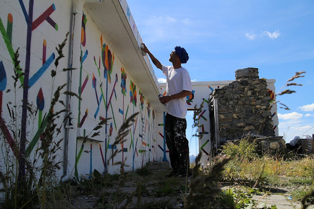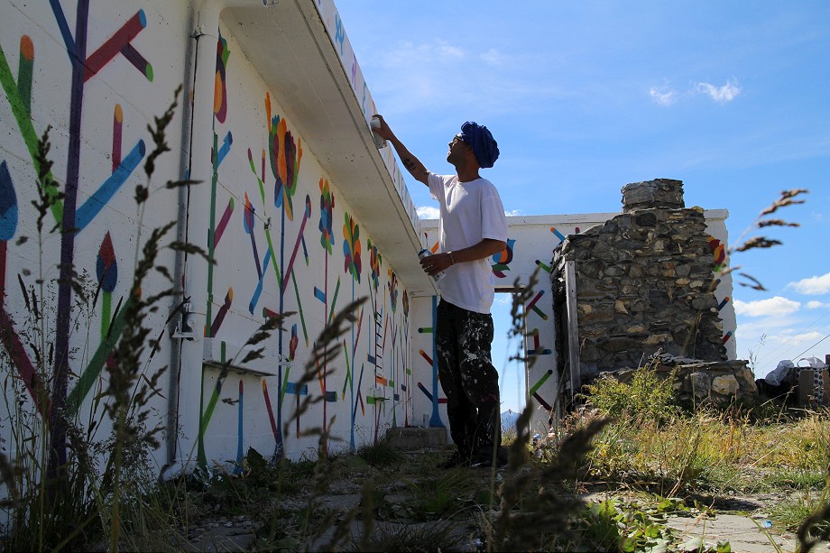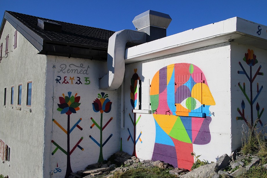 Using his highly stylized floral imagery and typography, he painted this minimalist mural that covers different walls of a house placed on the edge of a steep cliff. Inspired by the Latin palindromic sentence “Sator, Arepo, Tenet, Opera, Roas”, the image has a feel of hand embroidered cloth. Using warm, bright colors against the white background, the piece will surely look even more impressive when surrounded with snow. Along with floral elements he also painted a characteristic figurative profile portrait, built entirely of colorful patches.
