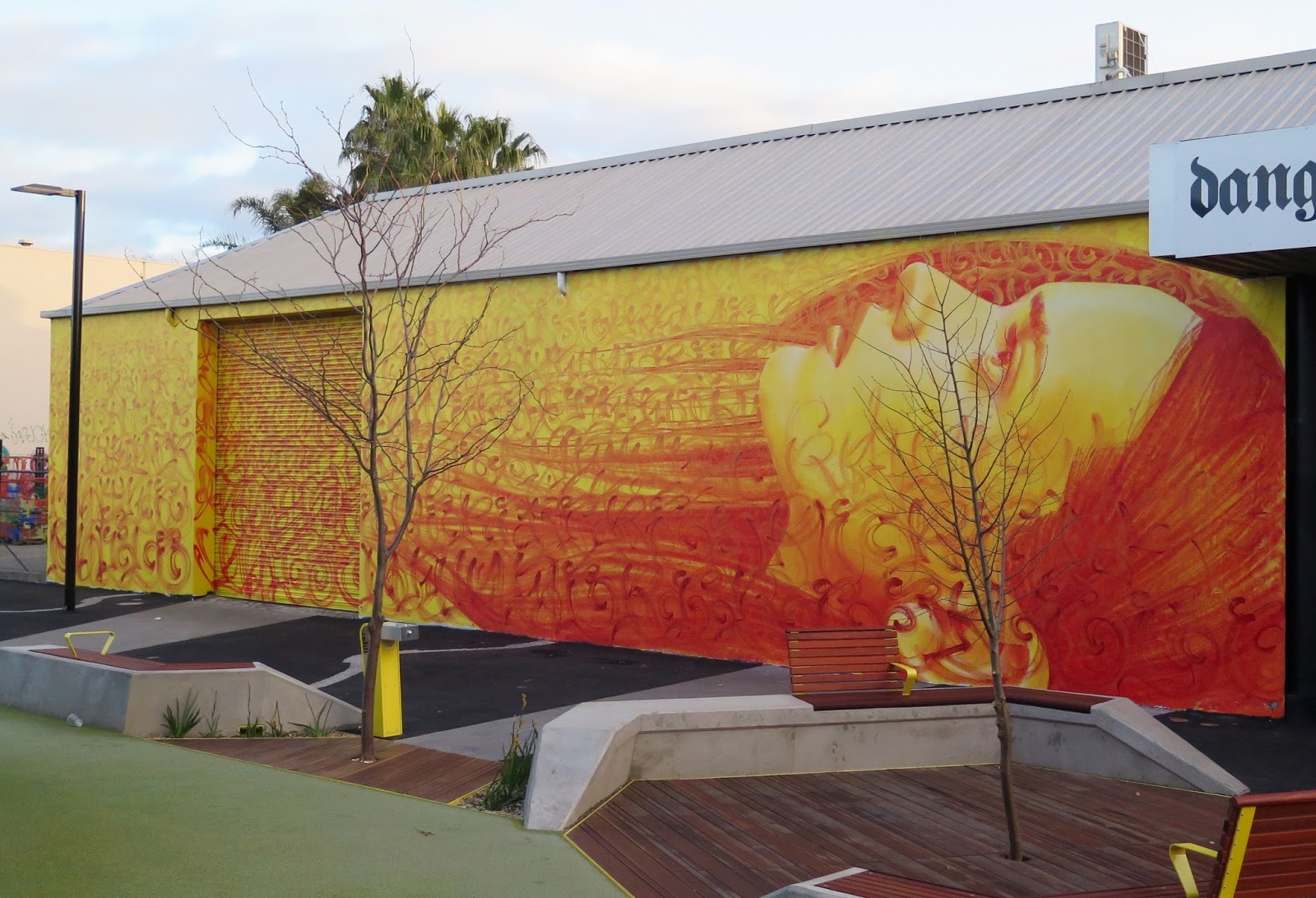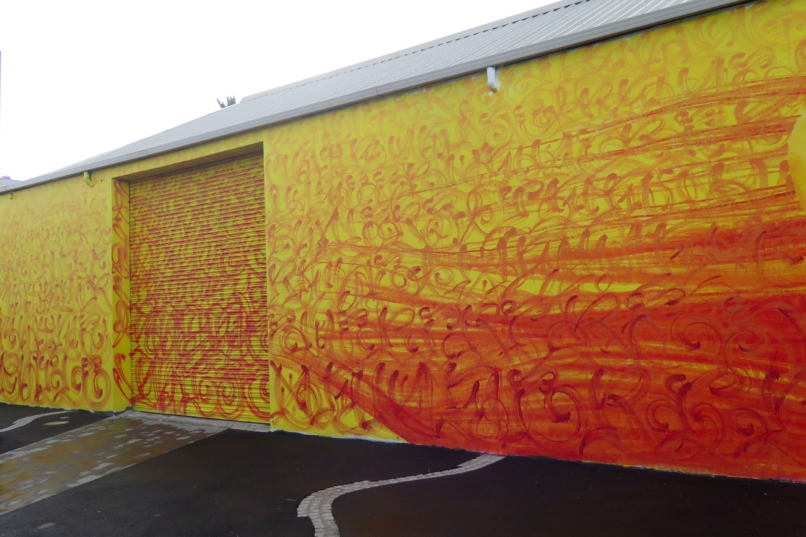 Using only red and yellow, the two artists blend street art portraiture and calligraphy to create a stunning new piece facing a recently finished council urban park.