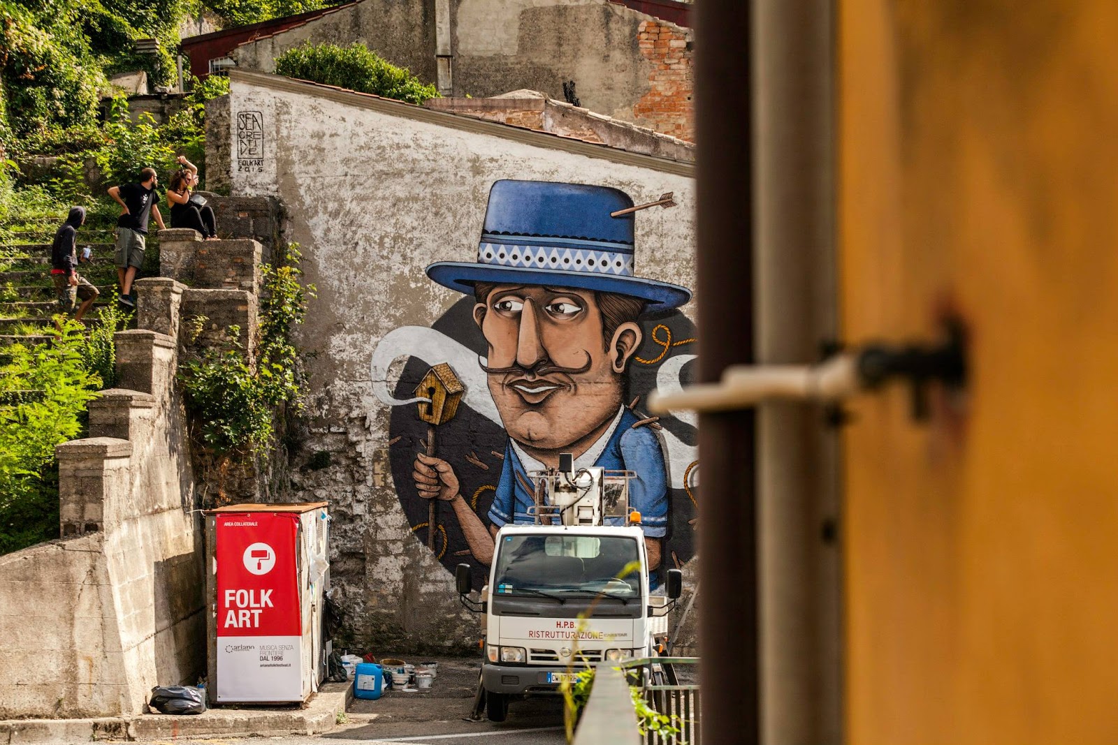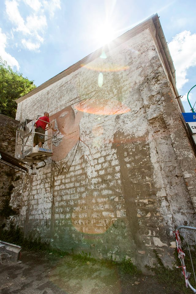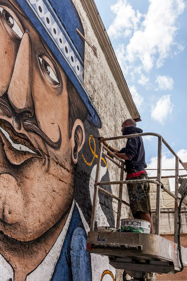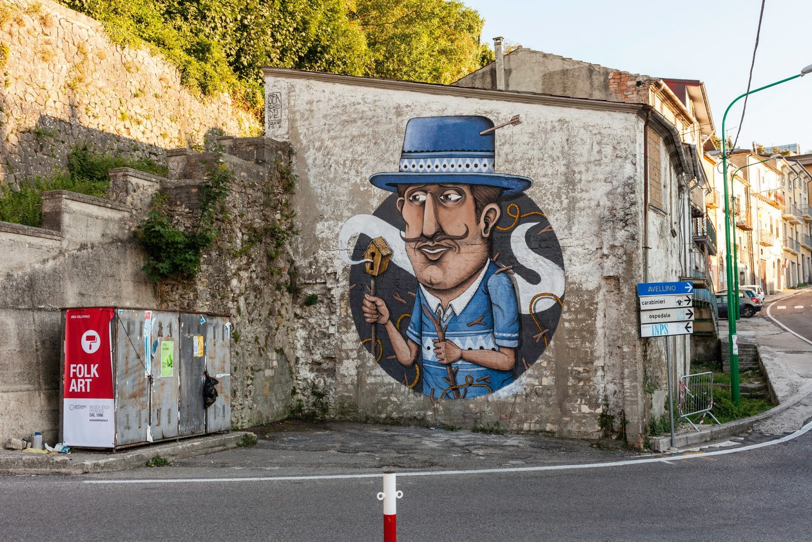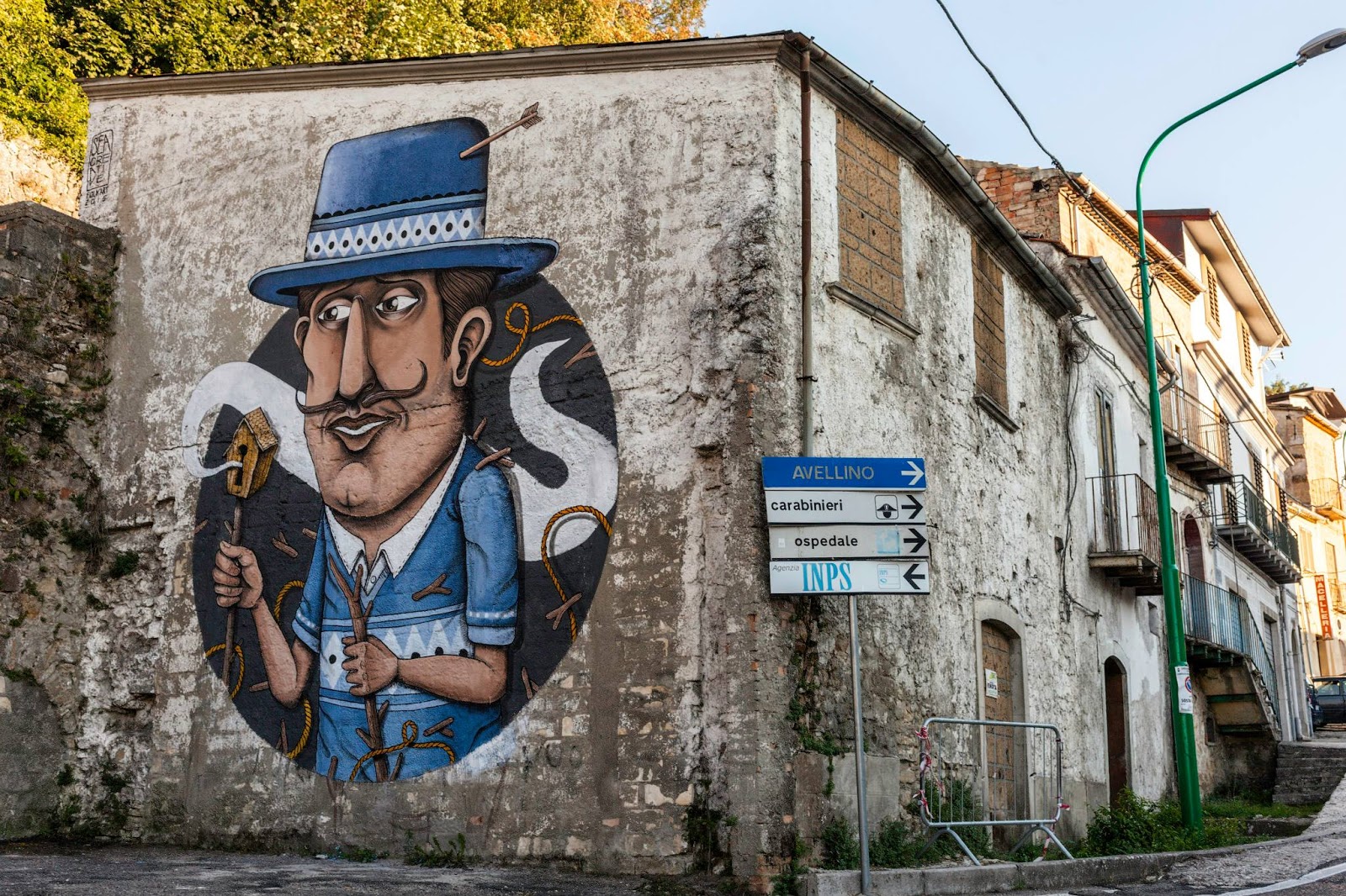 In town for the latest edition of the Ariano FolkFestival, the Italian artist created this great piece showing one of his signature illustrative characters. It took him about three days for this piece to be completed and was painted using Acrylic and brushes.