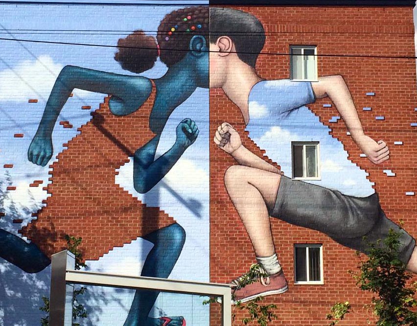 Specializing in painting characters on walls, the French artist created this signature piece showing two young kids running one into another. This time around, Seth cleverly incorporated the building’s bricks and the cloud’s background into each design. A beautiful addition to the streets of Montreal.